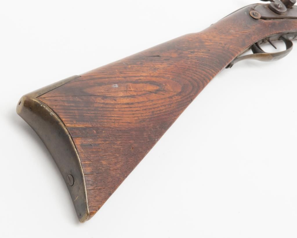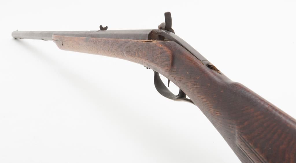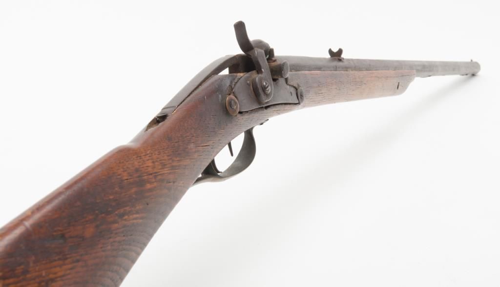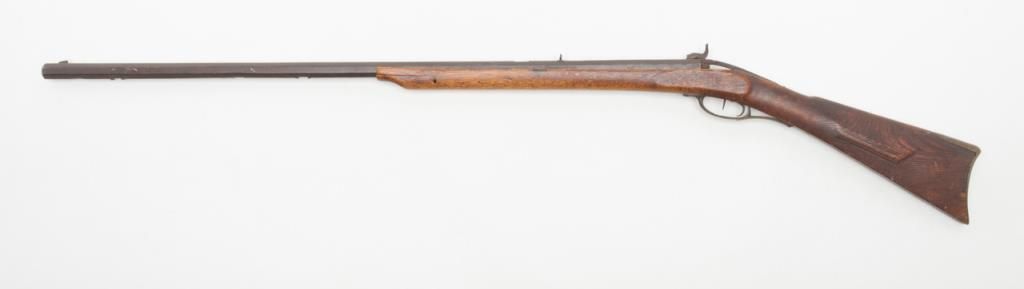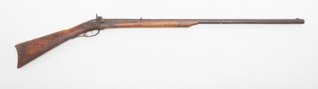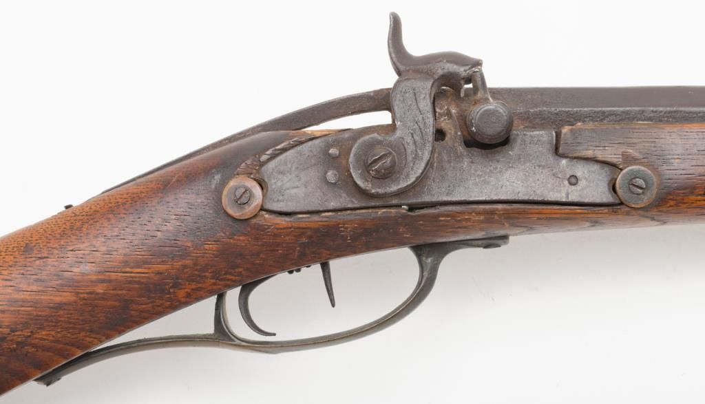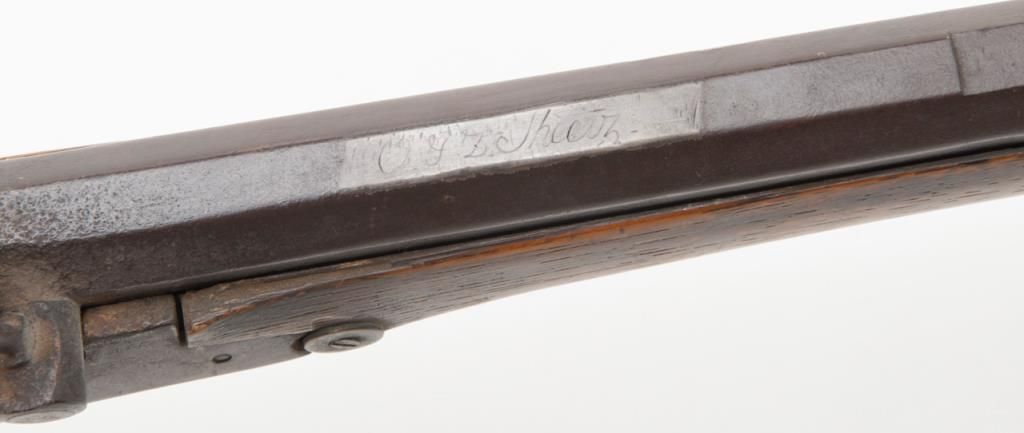 Percussion half stock rifle, .45 cal., 36” octagon barrel, plain wood stock, double set triggers that are working at time of description, in overall fair condition showing a dark patina to metal surfaces, barrel has inlaid silver plaque on top rib and is signed “O. L. Z. Sheetz”, although the double set triggers are working, the hammer does not stay on full cock; the lockplate is held in by 2 old screws and 2 old copper washers; the ramrod and its two ferrules are long missing andthe stock shows wear, some age cracks and is missing a section of wood beneath the upper tang and the back of the barrel assembly; there is also a small loss behind the end of the upper tang. Why the detailed description of an old piece ofAmericana like this? Because before it was “put up”, it likely provided food on a family’s table and gave protection for years and was repaired with whatever was available as people “made due” when finances were tight and didn’t dispose ofuseful tools when they could be repaired and kept in service. (Antique). Est.: $100-$200.