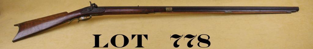 Percussion half-stocked plains type rifle, .36 cal., 40” octagon barrel signed “Philip H. Rose”, double set triggers, brass fore end cap, brass ramrod ferrules, replaced wood ramrod, brass trigger guard and butt plate,wood stock. This gun is in overall fair + condition showing a dark brown patina on metal surfaces, dark bore, good action with set trigger working at time of description; wood is overall fair + to good with some oldcracks, slight losses, mars and scratches from carry and storage; barrel maker may be researchable. Est.: $450-$850.