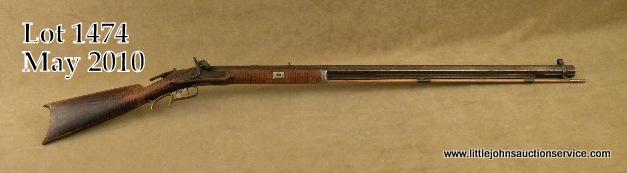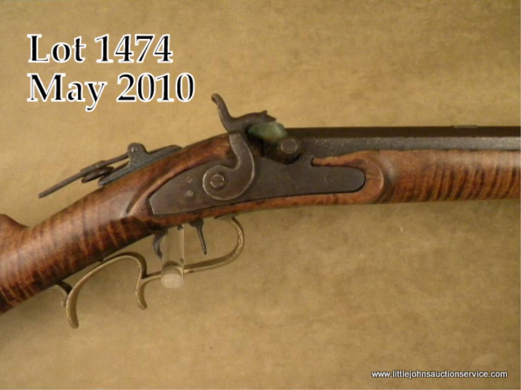 Percussion half stocked target rifle, .41 cal., 35” heavy octagon barrel marked “L.L. Carver”, brown finish, double set triggers, brass trigger guard and butt plate, pewter fore end, fold up rear tang sight, heavy iron hooded front sight,tiger stripe wood stock, replaced wood cleaning rod. This gun is in overall fair + condition with lots of patina and some pitting around the firing area at the breech of the barrel and on the top of the lock plate; the rear fixed sight has beenmoved forward and behind the hooded front sight is a more modern fixed blade sight; the action is good, the set trigger needs adjustment, the wood stock is worn but has a great look with even wear and some scattered scratches and small old losses Est.: $250-$500.