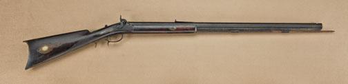 Percussion plains rifle circa 1840’s to 50’s, marked Wurflein inside patchbox and remnant of Philadelphia on lock. The rifle measures 47-1/2” overall with 32” medium to heavy weight octagon barrel of .40 caliber rifled. The barrel and lock show a heavy and dark brown to black patina finish with light to heavy scattered pitting and erosion. There is some light cleaning around the lock, otherwise totally uncleaned. The stocks are good with even weathering, wear, and darkening. The brass patchbox, buttplate, and triggerguard, are a very dark patina, and may have been plated at one time. The triggers are working, the rifle has seen exposure to the elements and been carried a long way and was found in Texas. Est: $400 - 800
