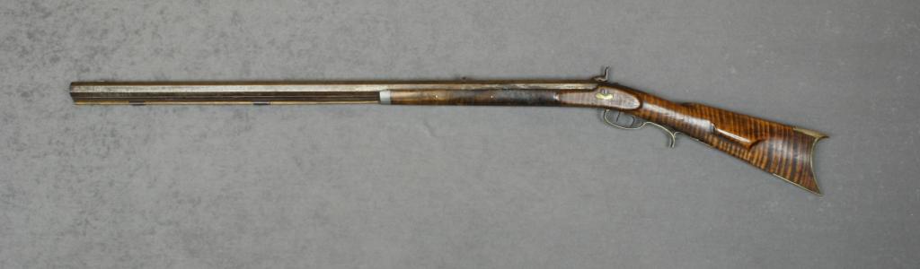Percussion plains type half stocked rifle, .40 cal., 35” octagon barrel, double set triggers, pewter forend, brass and iron furniture, ornate patchbox. This gun is in overall good condition showing a light greypatina on the barrel and brown patina on the lock plate (neither maker marked); old pitting near firing area; double set trigger working at time of description; stock is overall good with classic tiger stripegraining. Est.: $400-$600.