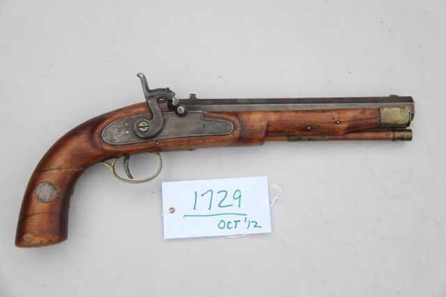 Percussion single shot pistol of .50 caliber with heavy 9” octagon barrel and full stock with a well-worn seated Liberty dime dated 1842 set into the right side of the grip and a Liberty 5 cent piece inset into the butt of the grip. The gun is in overall fair to good condition showing a lot of wear and character including an two old repairs to the grip and scattered old cracks and mars; brass mountings and a brass tipped ramrod;action not working. Est.: $500-$1,000.