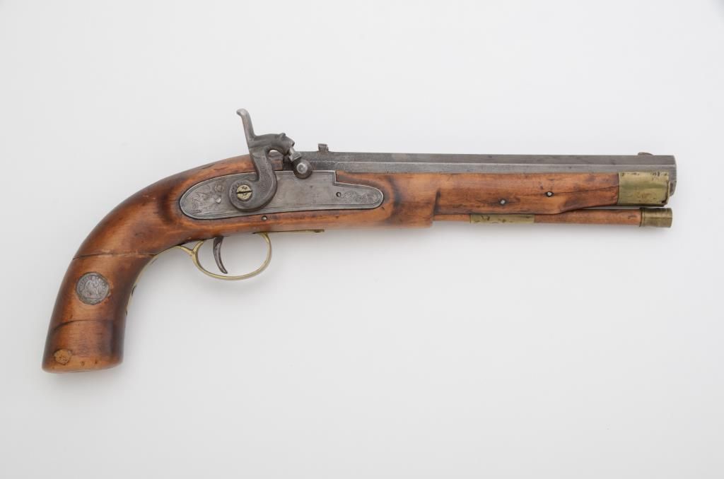 Percussion single shot pistol of .50 caliber with heavy 9” octagon barrel and full stock with a well-worn seated Liberty dime dated 1842 set into the right side of the grip and a Liberty 5 cent piece inset into the butt of the grip. The gun is in overall fair to good condition showing a lot of wear and character including an two old repairs to the grip and scattered old cracks and mars; brass mountings and a brass tipped ramrod;action not working. Est.: $500-$1,000.