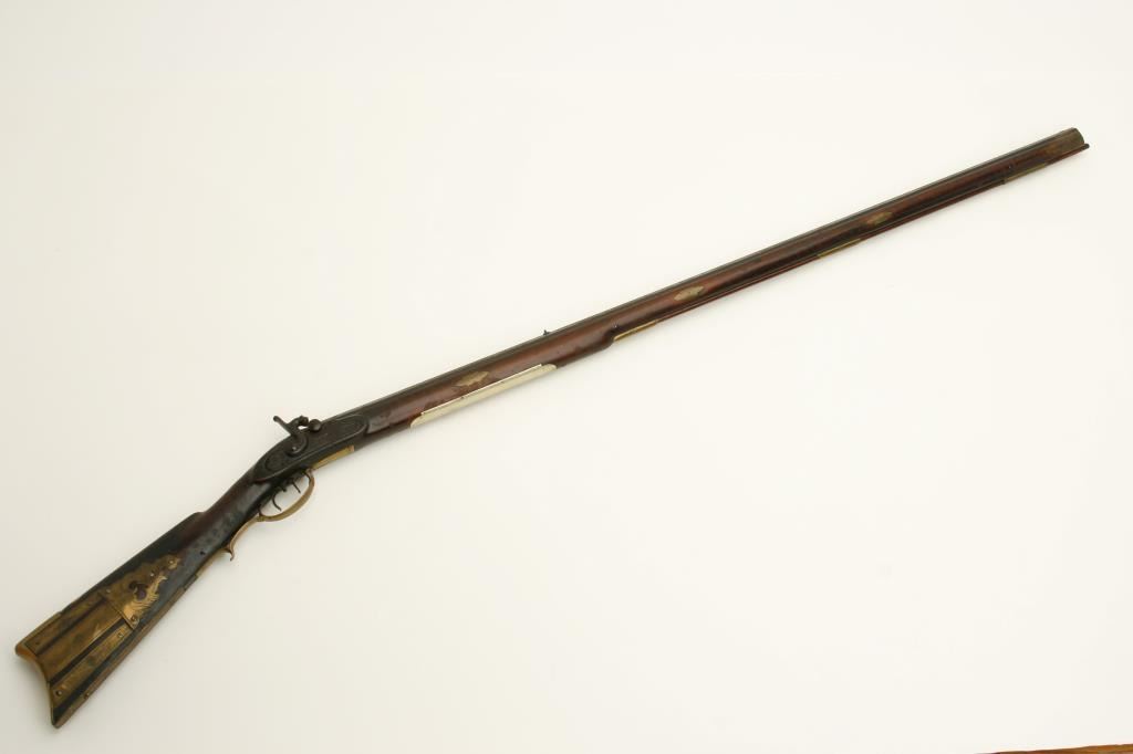 barrel rifle, .38 caliber, 44” octagon barrel with maker’s name inscribed on top barrel flat but worn and un-readable; double set triggers working at time of description, brass mountings plus German silver decoration on butt stock; rifle shows dark patina to metal along with scattered areas of surface erosion and rust; brass patchbox is tastefully accomplished; heavy patina on wood with the lock area, wrist and butt stock appearing to have be darkened, possibly from hanging over a fireplace for a long time. (Antique). Est.: $500-$1,000.