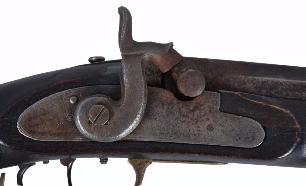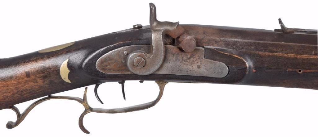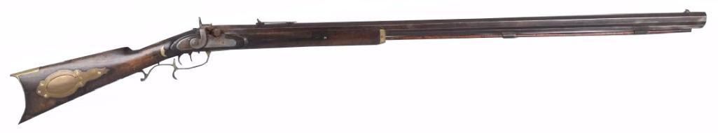 38" octagon barrel, action works with set trigger, stock appears refinished and has a repair in front of lock. Displays well . Very Good
