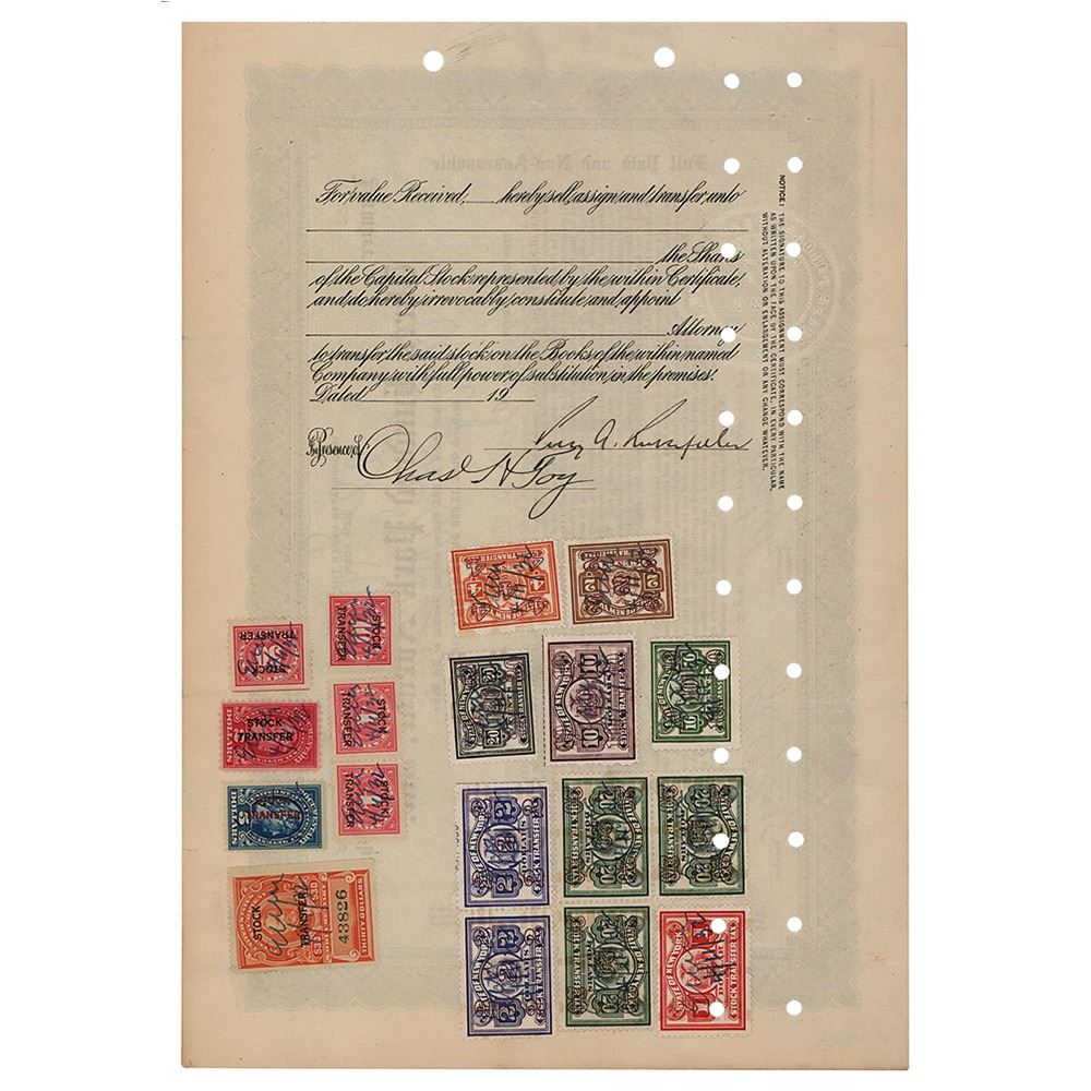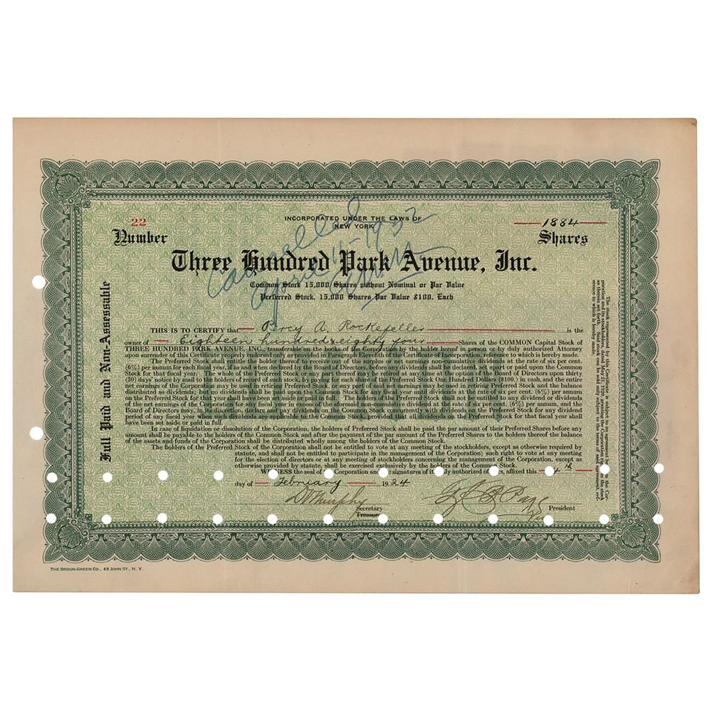 Partly-printed DS, one page, 12.5 x 8.5, February 4, 1924. Stock certificate for 1884 shares of Three Hundred Park Avenue, Inc., issued to Percy A. Rockefeller, who has signed on the reverse in fountain pen. In fine condition.
