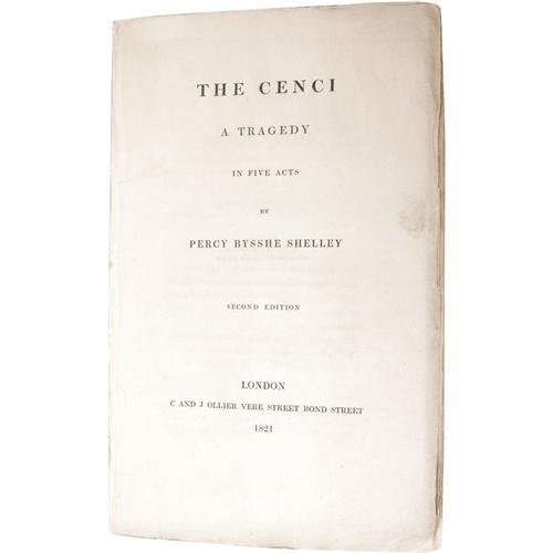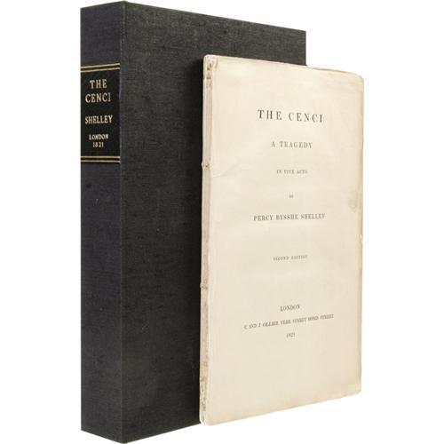 <B>Percy Bysshe Shelley: <I>The Cenci: A Tragedy in Five Acts</B></I>.</B></I> (London: C and J Ollier, 1821), printed by C.H. Reynell, second edition, 103 pages, paper wrappers, 8vo (5.5" x 8.75"), clear glassine cover. Housed in a black cloth solandar box with a black and gilt leather title plate on the spine. The book is good, with some wrinkling to the edges, mild age-toning, and light foxing. The slipcase shows mild finger print soiling. The following background is from Betty T. Bennett's <I>Mary Wollstonecraft Shelley An Introduction</B></I>: <I>The Cenci,</B></I> a story of the 16th-century Cenci family depicts the vicious cruelty of Count Francesco Cenci, whose wealth protected him from punishment for murdering his own sons and raping Beatrice, his daughter. After the rape, Beatrice conspired with other family members to murder him. Victims first of Cenci's unlimited power, then of the Church's, Beatrice and her co-conspirators were caught and executed. The Shelleys collaborated on this project in several ways. Mary Shelley translated into English "Relazione della morte della famiglia Cenci sequita in Roma il di II Maggio 1599," the original Italian manuscript from which P. B. Shelley worked, for intended publication with P. B. Shelley's tragedy. <BR><BR>Percy began to dramatize <I>The Cenci</B></I> following the death of their one-year-old daughter Clara to dysentery in September 1818. In June of the following year, their three-year-old son William died of malaria. Both Shelleys deeply mourned their loss, but the intensity of Mary's feelings caused her to distance herself from Percy. During this period of estrangement, the Shelleys' most harmonious communication appears to have been through their writing. This is the only work that Percy discussed with Mary part by part as he wrote it. <I>From the Betty Bennett Collection.</B></I><BR><BR><b>Shipping:</b> Books & Catalogs (<a target="_blank" href="http://www.heritageauctions.com/common/shipping.php">view shipping information</a>)