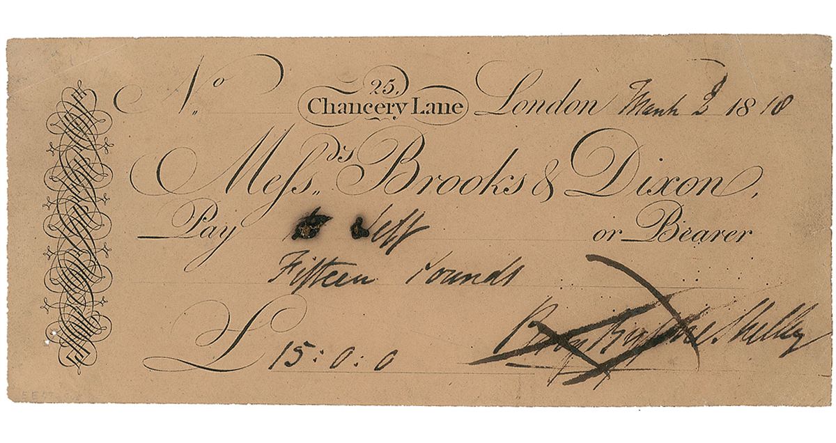 Bank check, 7.75 x 3.5, filled out and signed by Shelley, “Percy Bysshe Shelley,” payable “to self” for £15, March 2, 1818. A couple unobtrusive creases to corners, cancellation notations passing through his first and middle names, and slight ink erosion to the recipient area, otherwise fine condition. This check marks an extremely important date for Shelley and his family, both personally and professionally. January 1818 saw the publication of his most famous poem, ‘Ozymandias,’ as well as the release of the immensely influential story written by his wife—Mary Shelley’s Frankenstein. Additionally, just ten days after writing this check the Shelleys would embark for Italy, where they visited with Byron. Shelley’s writing was reinvigorated and he published Julian and Maddalo later that year, a lightly disguised rendering of his boat trips and conversations with Byron; this poem marked the appearance of Shelley's ‘urbane style.’ In addition to its important date association, Shelley is rare in any autographed material.