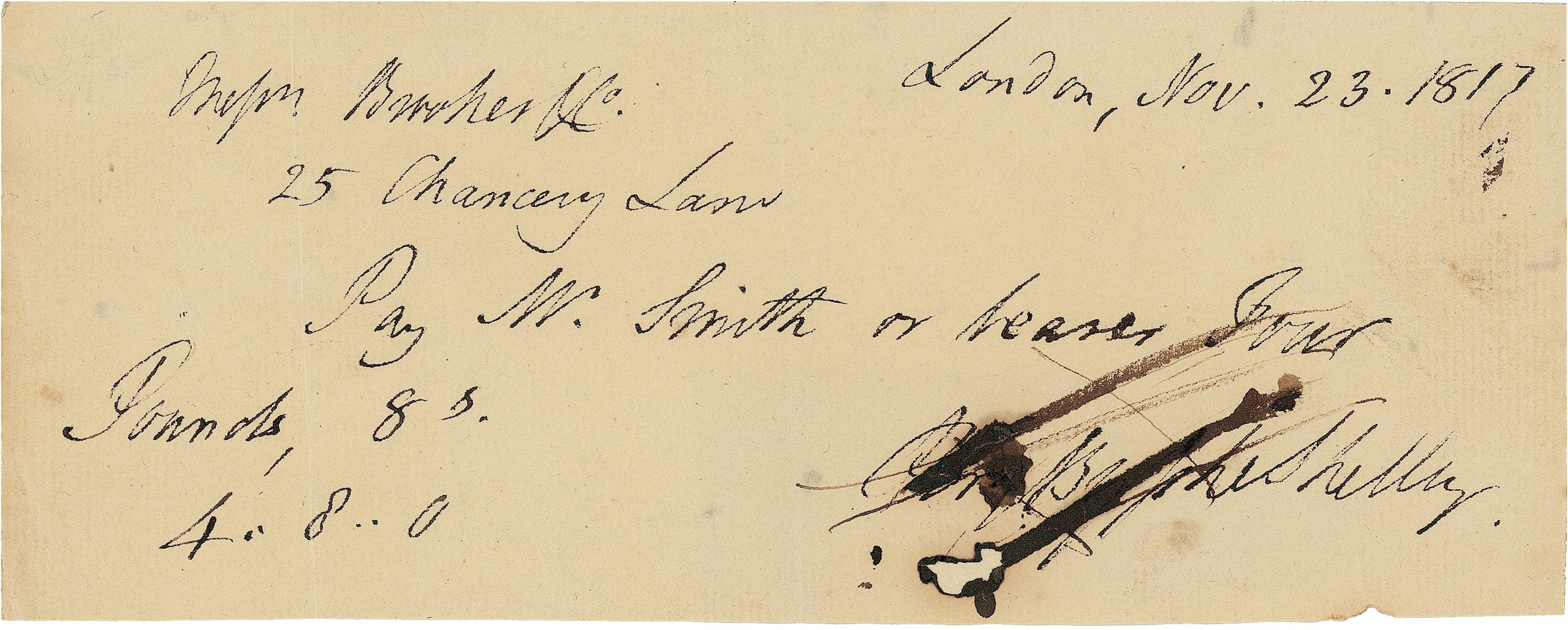 English writer (1792–1822) who takes a place among the most original poetic voices of his day and one of the most influential literary figures of the Romantic era. His much-anthologized work includes such classics as “Ozymandias” and “Prometheus Unbound.” Manuscript personal check, 7.25 x 3, filled out and signed by Shelley, payable to Mr. Smith or bearer for £4.8.0, November 23, 1817. Areas of mild soiling, small hole from ink erosion at bottom edge (repaired from reverse and not affecting any writing), and the usual heavy ink cancellations to first and middle names of signature (something virtually all Shelley checks exhibit), otherwise fine condition. “Shelley” is dark and distinct and the check presents a clean appearance overall. Shelley wrote his most famous work, “Ozymandias,” in December 1817; it was first published in January 1818. Pre-certified John Reznikoff/PSA/DNA and RRAuction COA.