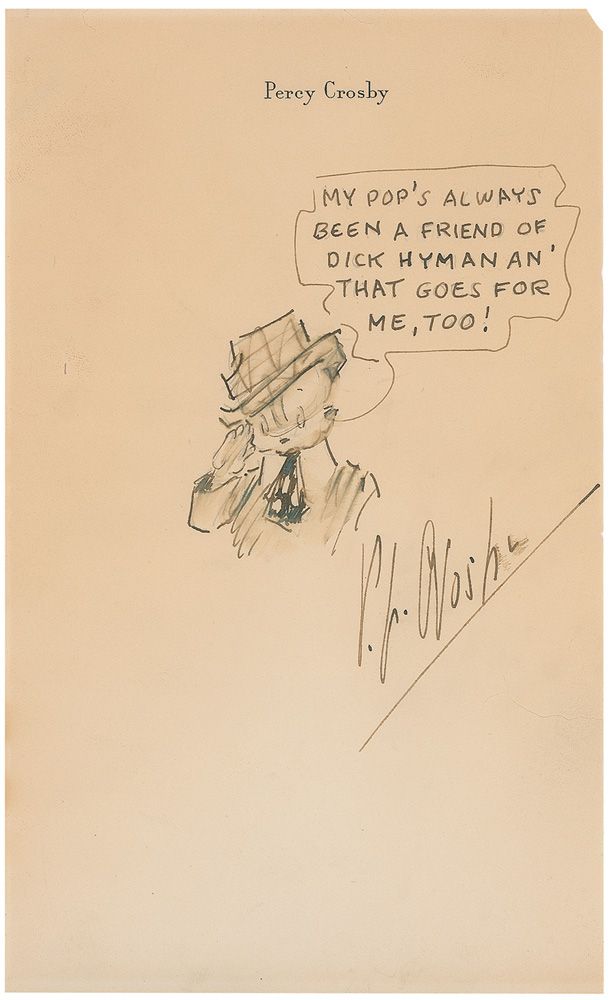 Author, illustrator, and cartoonist (1891–1964) best known for his comic strip ‘Skippy.’ Original vintage signed and inscribed ink sketch of Skippy in a suit, saying “My pop’s been a friend of Dick Hyman an’ that goes for me, too!” and signed, “P. L. Crosby,” on an off-white 5.25 x 8.75 sheet of personal stationery. A tear to the right border and a trivial brush to the end of the signature, otherwise fine condition.