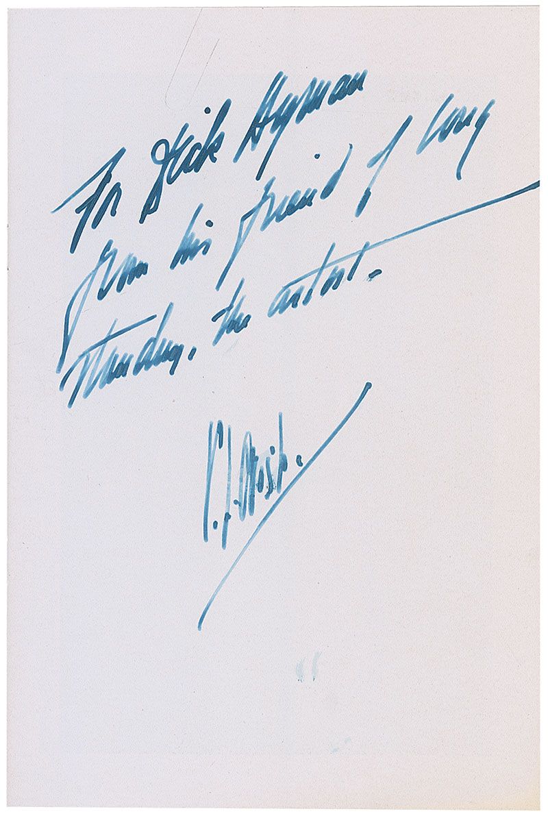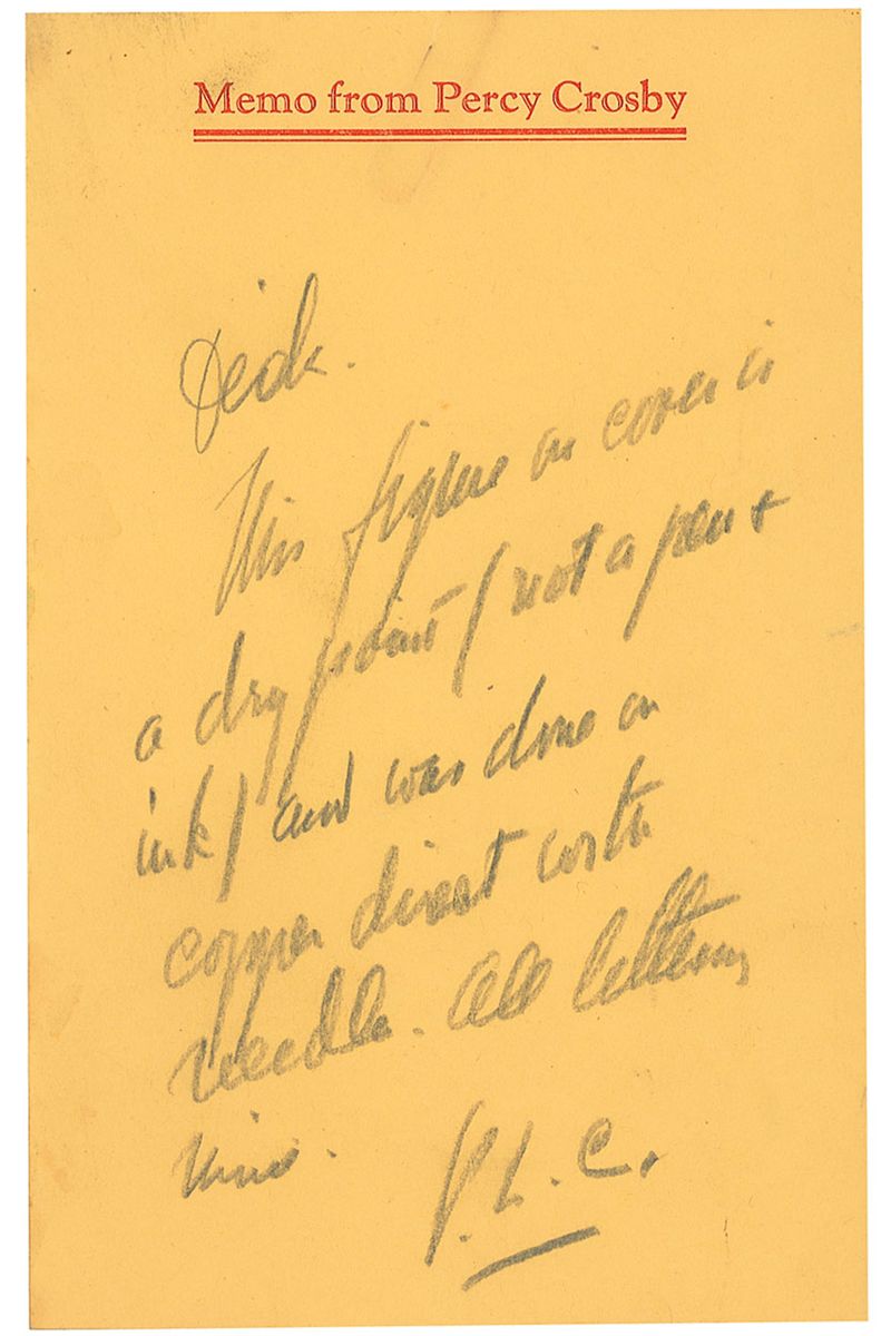 Author, illustrator, and cartoonist (1891-1964) best known for his comic strip ‘Skippy.’ Two items: one high-quality program for a Crosby exhibition at Jacques Seligmann & Co in New York, 6 x 9, signed and inscribed on the first page in blue ink, “For Dick Hyman, from his friend of long standing, the artist, P. L. Crosby”; and an ANS in pencil on personal letterhead, signed “P. L. C.,” 4 x 6, in full: “Dick, This figure on cover is a dry point (not a pen & ink) and was done on copper direct with needle. All lettering mine.” In fine condition, with a paperclip impression to the top of both, and some scattered soiling to the memo.