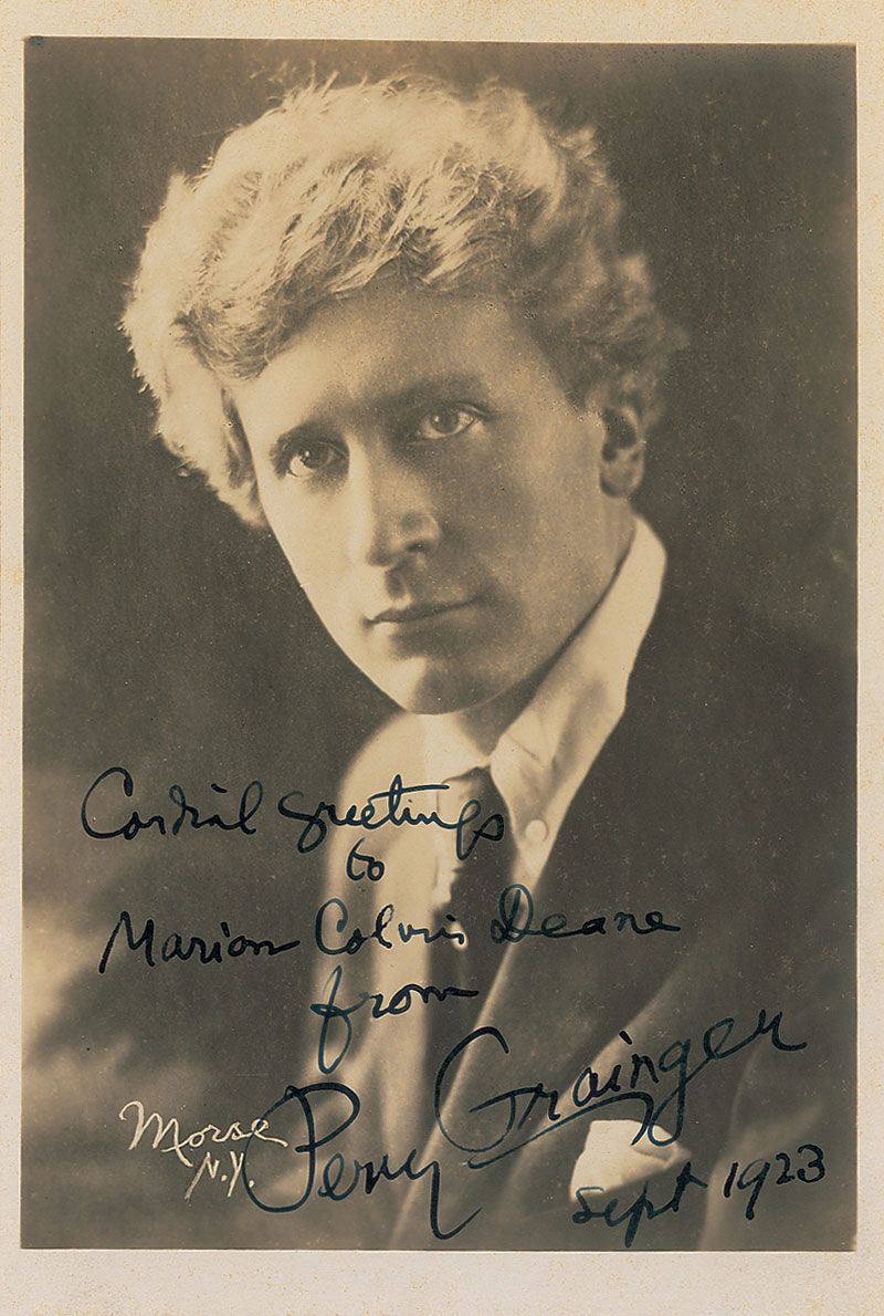 Well-regarded Australian-born pianist, conductor, and composer (1882–1961) best known for his folk settings and colorful experimental works. Vintage matte-finish 5 x 7 photo, signed and inscribed in fountain pen “Cordial greetings to Marion Coloris Deane from Percy Grainger Sept 1923.” In fine condition.