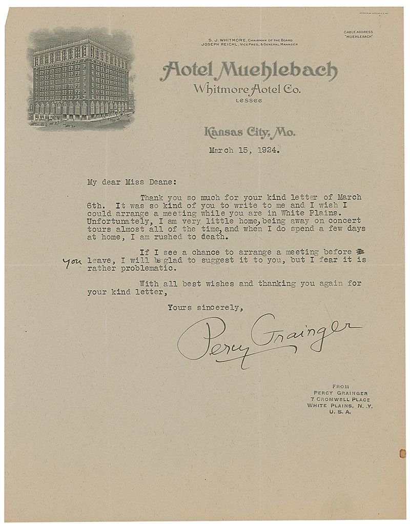 TLS, one page, 8.5 x 11, Hotel Muehlebach letterhead, March 15, 1924. Letter to an admirer. In part: “It was kind of you to write me and I wish I could arrange a meeting while you are in White Plains. Unfortunately, I am very little home, being away on concert tours almost all of the time, and when I do spend a few days at home, I am rushed to death.” In fine condition, with intersecting folds, one through a single letter of signature, and a stamp below signature.