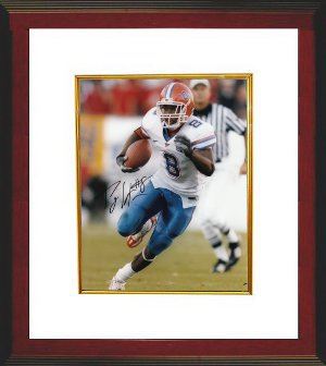Percy Harvin finished his college career as one of the most prolific offensive threats in school history. In three seasons, he totaled 133 catches for 1,929 yards and 13 touchdowns, while rushing the ball 194 times for 1,852 yards with 19 touchdowns. His 32 career touchdowns is the most ever by a University of Florida wide receiver. He is the only player in UF history to rush for 100 yards and have 100 yards receiving in the same game (against Vanderbilt, 2007). Percy has hand autographed this Florida Gators 8x10 Photo. Custom White Mat and Premium Wood Frame as shown. FI Hologram and Certificate of Authenticity from Athlon Sports.
