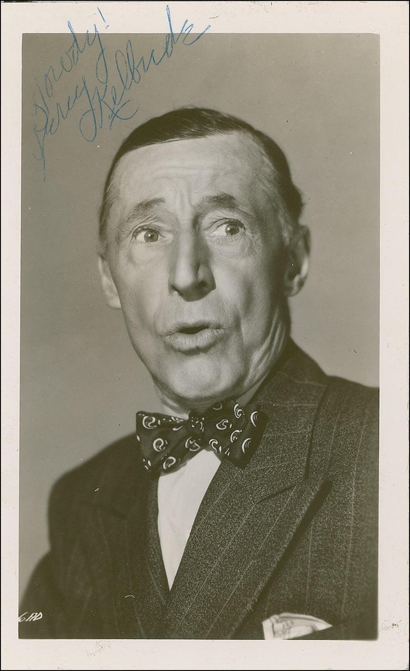 Character actor (1888–1964) best remembered as Pa Kettle. Vintage glossy 3.5 x 5.5 photo of Kilbride with a shocked expression, signed in blue ballpoint “Howdy! Percy Kilbride.” Upper right corner crease, some light surface impressions and scratches, and paper residue on the reverse from past mounting, otherwise fine condition. Accompanied by an unsigned photo of Kilbride in character with Marjorie Main.