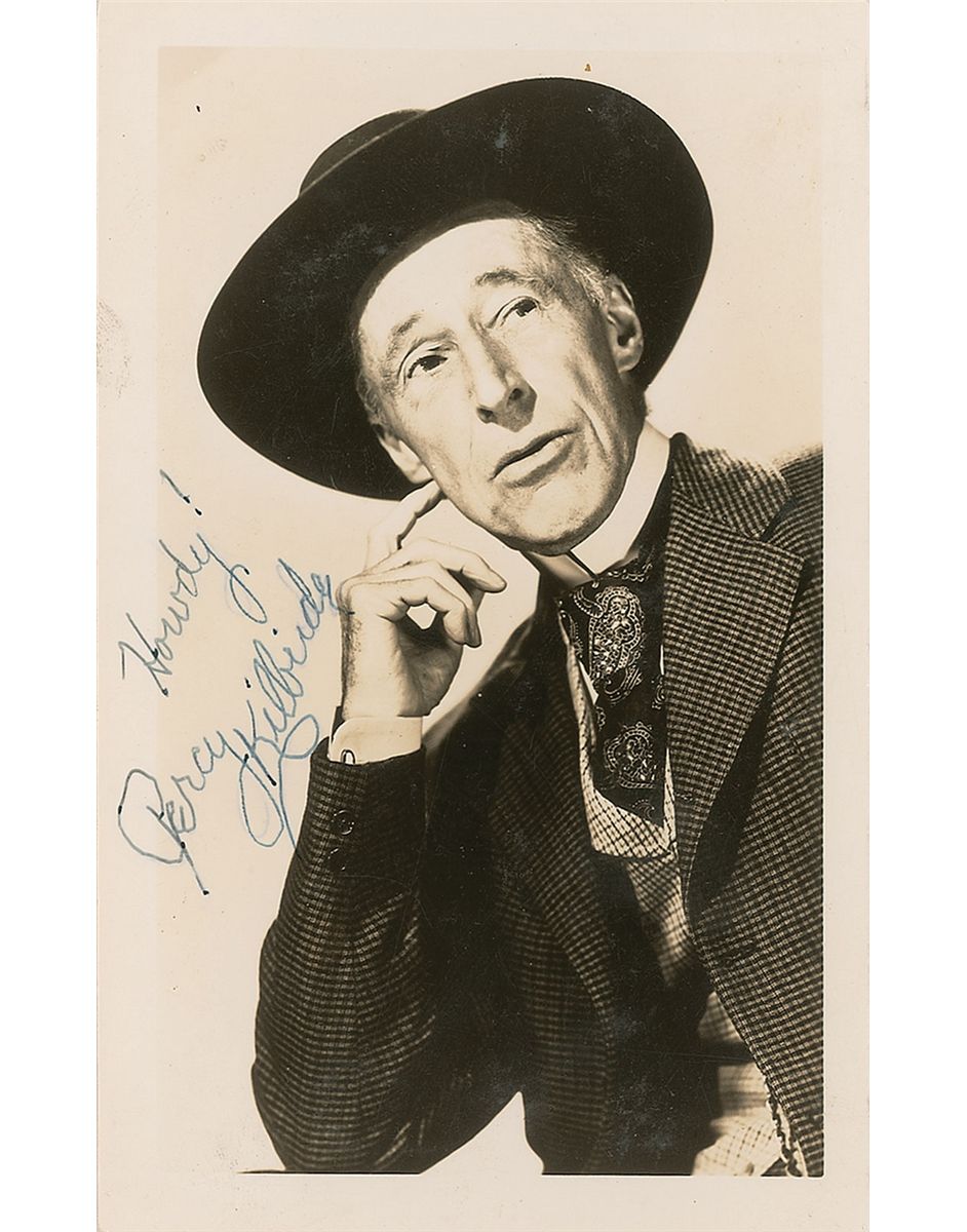 Vintage glossy 3.5 x 5.5 photo, signed in blue ink, “Howdy! Percy Kilbride.” In very good condition, with scattered surface marks and impressions, silvering to darker areas, and Kilbride signing over an unsuccessful first attempt.