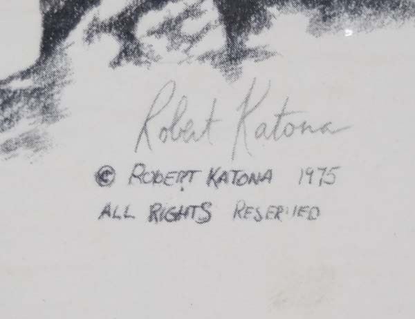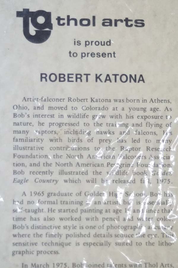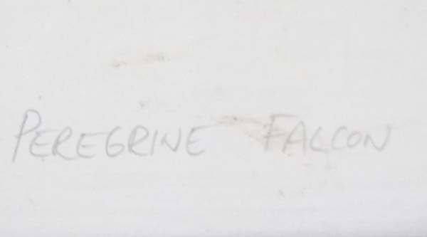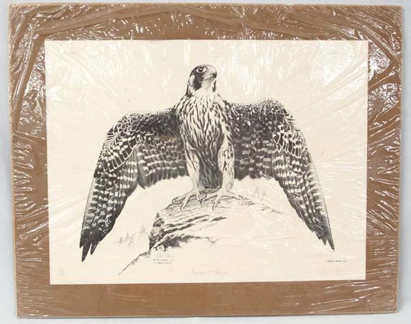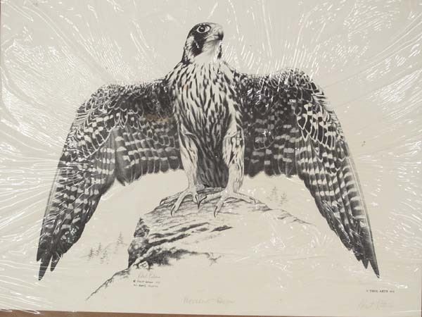 Peregrine Falcon Signed & Numbered Print by Robert Katona 116/500, measures 12.5''H x 16.5''W, FYI: ''Based in New York for seven years, he created a form of computer art, Techism, made with colored plexiglas and electronics. He is a falconer and the first artist in North America to do falconry art. His knowledge of birds of prey has led to illustration contributions to the Raptor Research Foundation and the North American Peregrine Foundation.''
