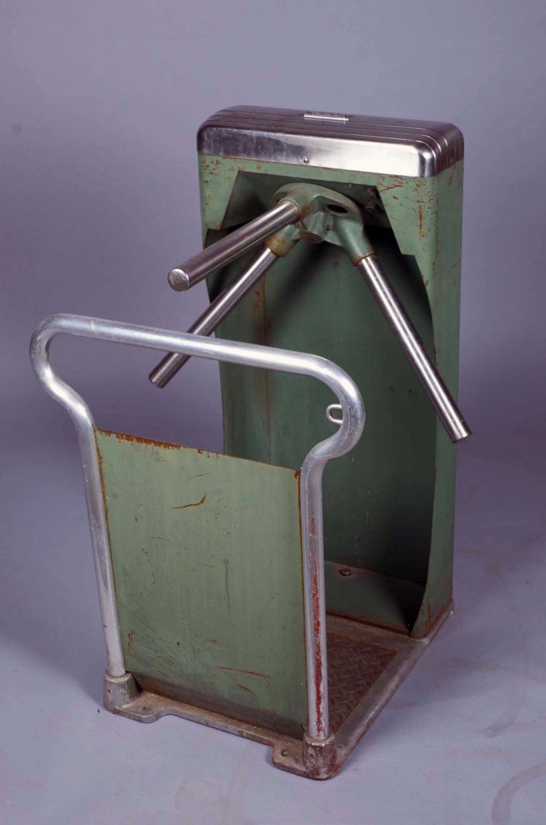 Made by Perey of New York. Original green paint has scuffs and scratches, yet the turnstile operates smoothly. Condition (Very good). Size 24" x 32-1/2" x 39"