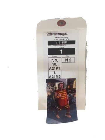Perfect Harmony Hymn-A-Thon (2020) Kip (Joshua Hoover) screen worn, hero, red with yellow straps (Wrangler) sleeveless shirt (xxl), red (Levi) pants with yellow straps (40/32). Wardrobe tag included with picture, worn in scenes 7,9,10.
