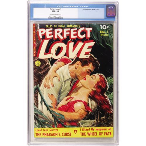 <B>Perfect Love #3 (Ziff-Davis, 1951) CGC NM+ 9.6 Cream to off-white pages.</B></I> This book has that slick look that's so characteristic of Ziff-Davis publications. If you don't have a ravishing redhead to hold in your arms like this cover stud does (or even if you do), you can at least acquire a very lovely comic -- no copy of the issue has been graded higher by CGC as of this writing. Overstreet 2006 NM- 9.2 value = $115. CGC census 3/07: 3 in 9.6, none higher.<BR><BR><b>Shipping:</b> Comics - Slabbed (certified) (<a target=""_blank"" href=""http://www.heritageauctions.com/common/shipping.php"">view shipping information</a>)