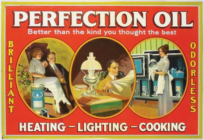 Perfection Oil Tin Over Cardboard Sign. Tiny perimeter scratches and rub on left side otherwise excellent condition. 19 X 13 inches.