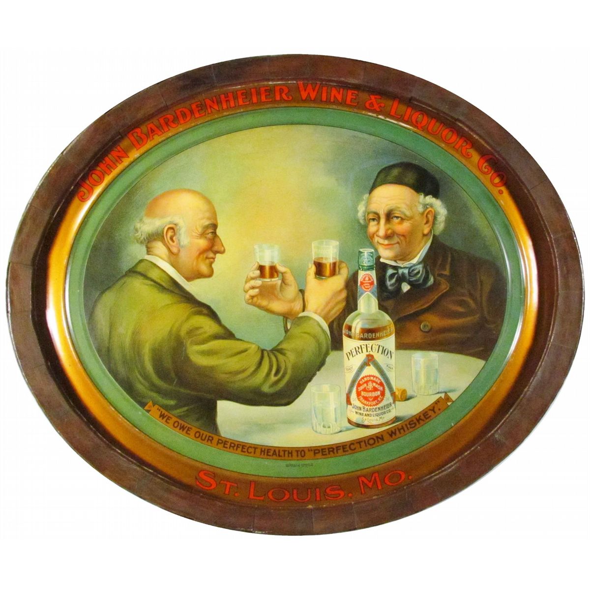 Perfection Whiskey Tin Front Oak Whiskey Barrel Sign. John Bardenheier Wine & Liquor Co. St. Louis. Depicting Gentleman toasting. Excellent condition. 24 1/2 X 20 1/2 X 5 1/2 inches.