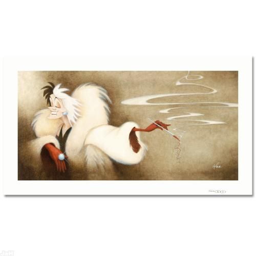 With the essence of Disney and the talent of Mike Kupka, Cruella de Vil is just how you remember her! "Perfectly Wretched" is a limited edition giclee on canvas, numbered and hand signed by Kupka. This piece is licensed by Disney Fine Art. Includes Certificate of Authenticity! Measures approx. 24" x 12" (image).