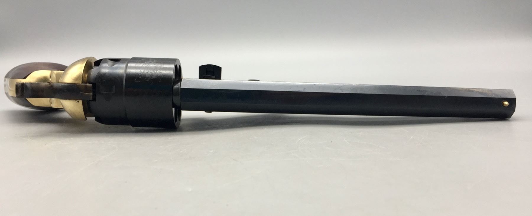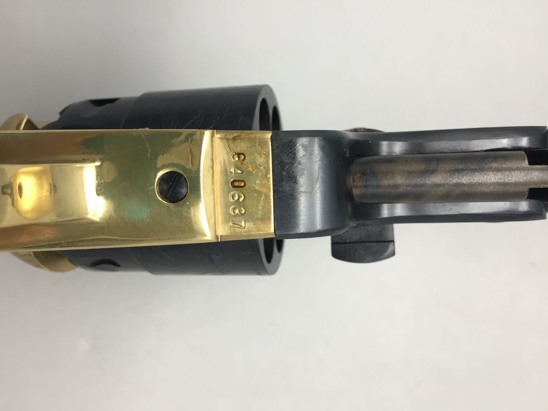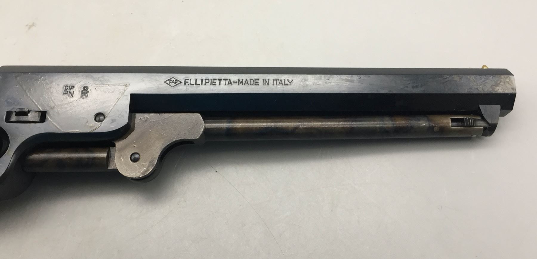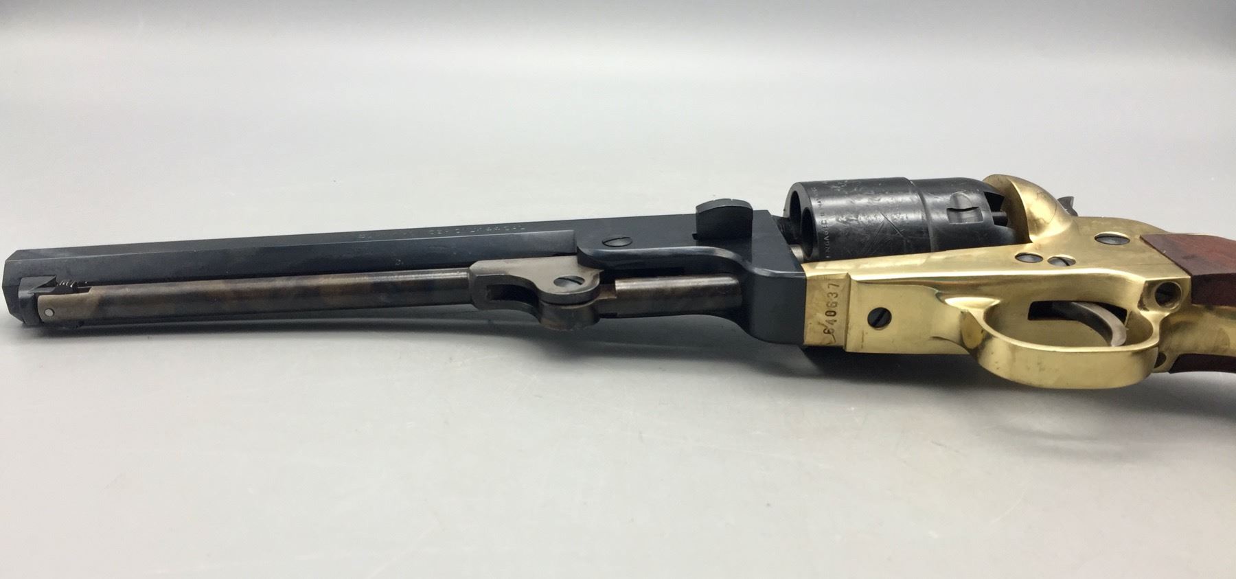 Description: For your enjoyment, we offer for sale this 1851 Navy Revolver is a .44 caliber with a brass frame and walnut grips and in its original box and paperwork. Appears to be in unfired condition. Maker: F.LLI PIETTA, Performance Fire Arms CO. Approx. Age: Modern. Serial No. 640637. Size: Barrel measures 7-1/2†with an overall length of 14â€. Condition: Good. Please look closely at the pictures - they are an important part of our description. Shipping: There will be a $15 handling / packaging fee for shipping this lot. The actual cost of postage will be added on top of that. *BLACK POWDER Replica firearm DOES NOT REQUIRE an FFL Transfer*