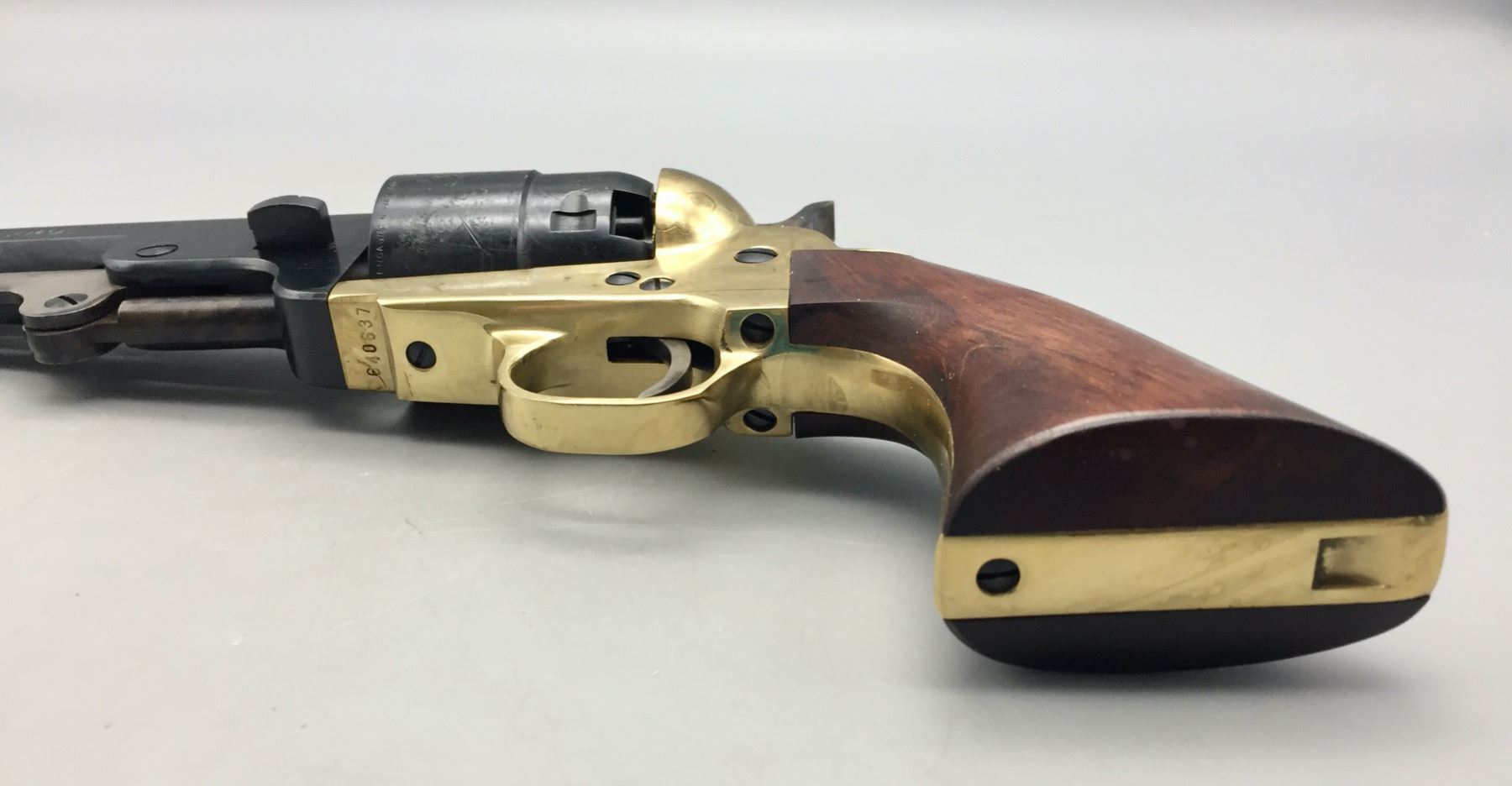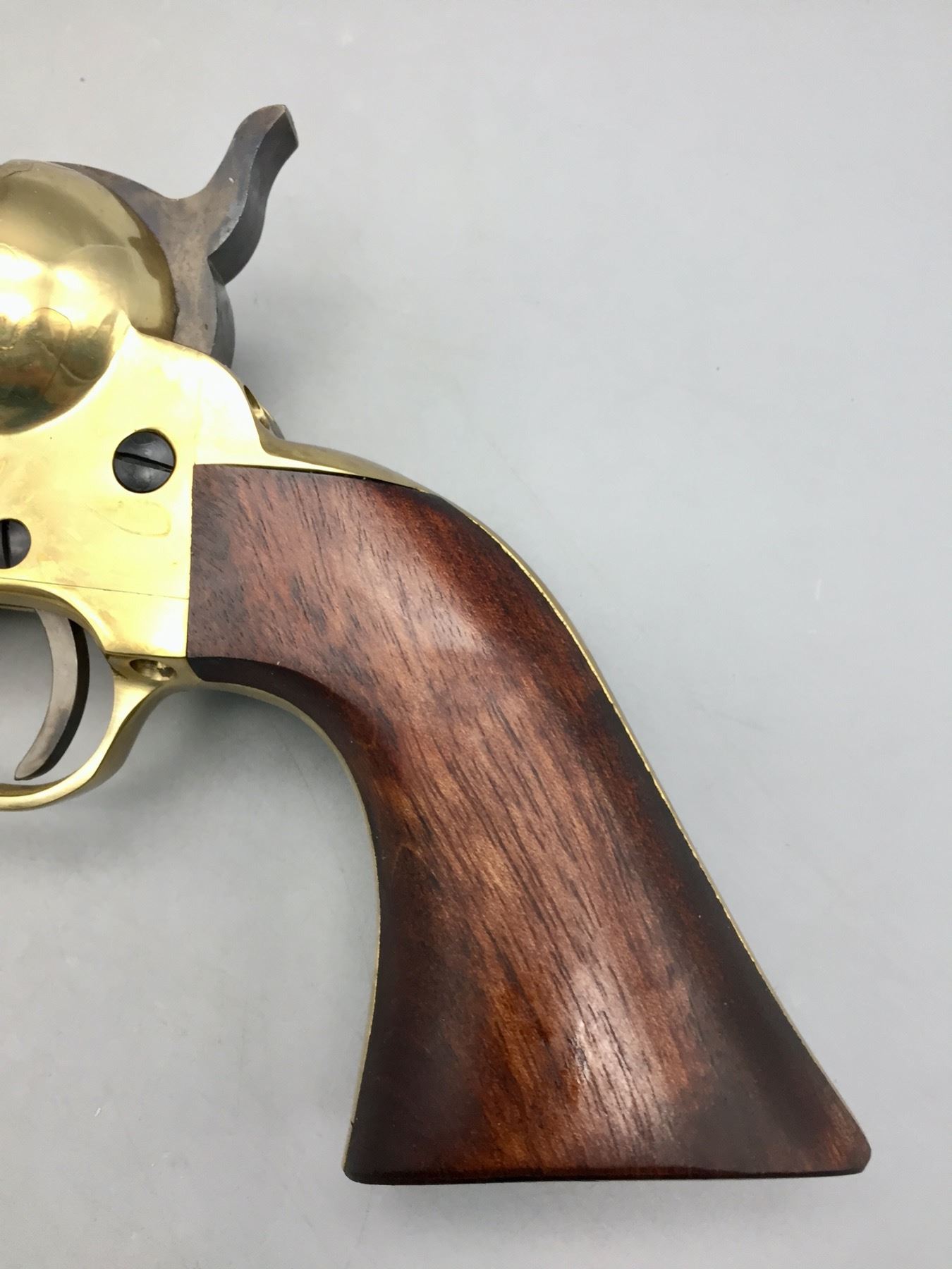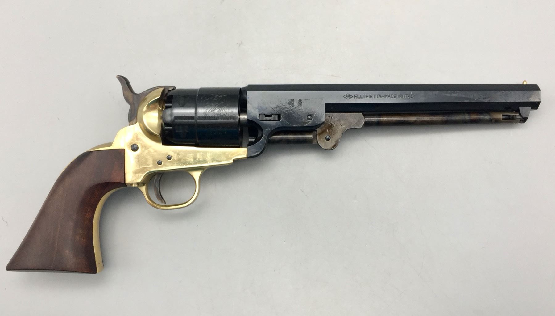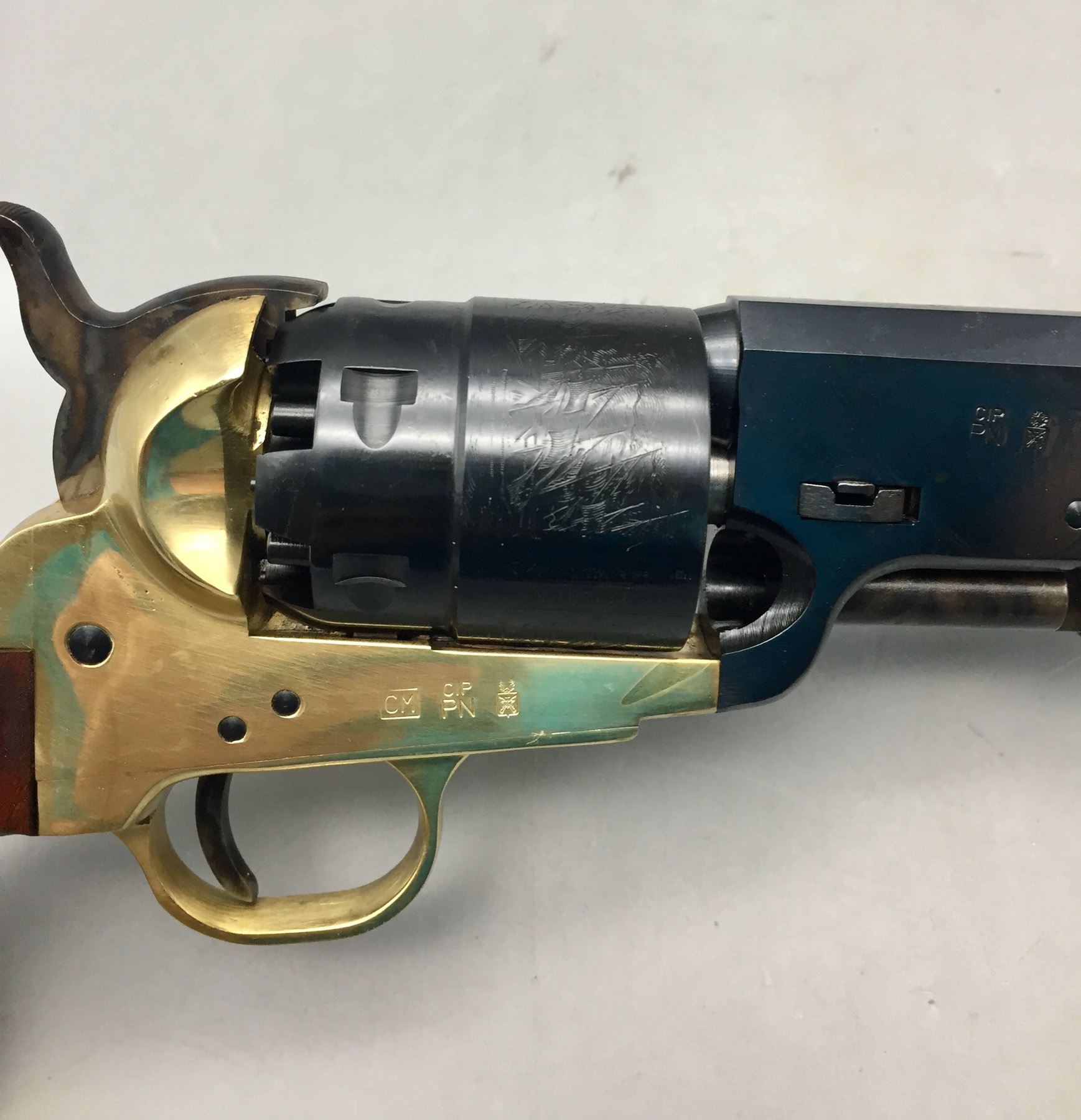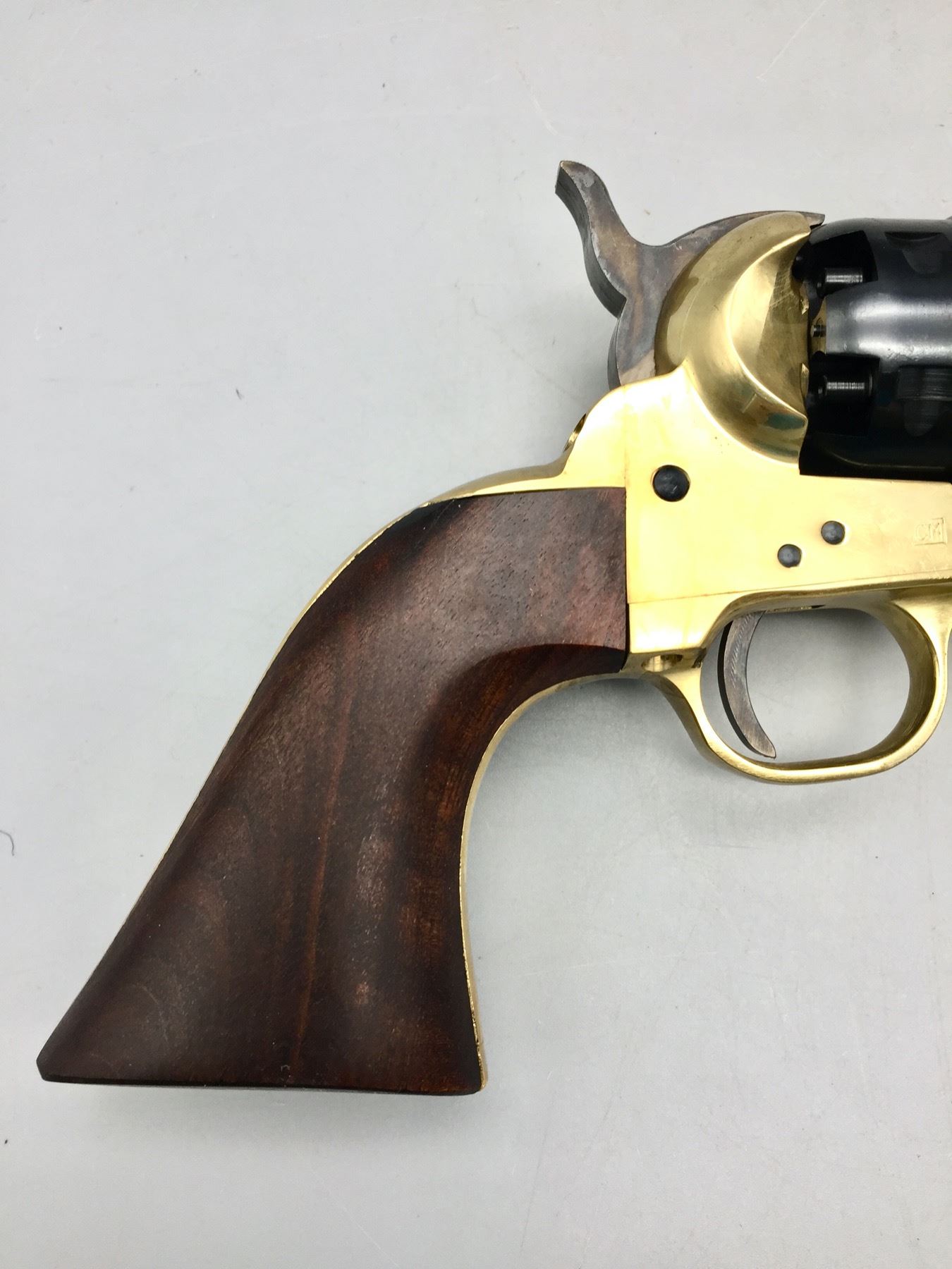 Description: For your enjoyment, we offer for sale this 1851 Navy Revolver is a .44 caliber with a brass frame and walnut grips and in its original box and paperwork. Appears to be in unfired condition. Maker: F.LLI PIETTA, Performance Fire Arms CO. Approx. Age: Modern. Serial No. 640637. Size: Barrel measures 7-1/2†with an overall length of 14â€. Condition: Good. Please look closely at the pictures - they are an important part of our description. Shipping: There will be a $15 handling / packaging fee for shipping this lot. The actual cost of postage will be added on top of that. *BLACK POWDER Replica firearm DOES NOT REQUIRE an FFL Transfer*