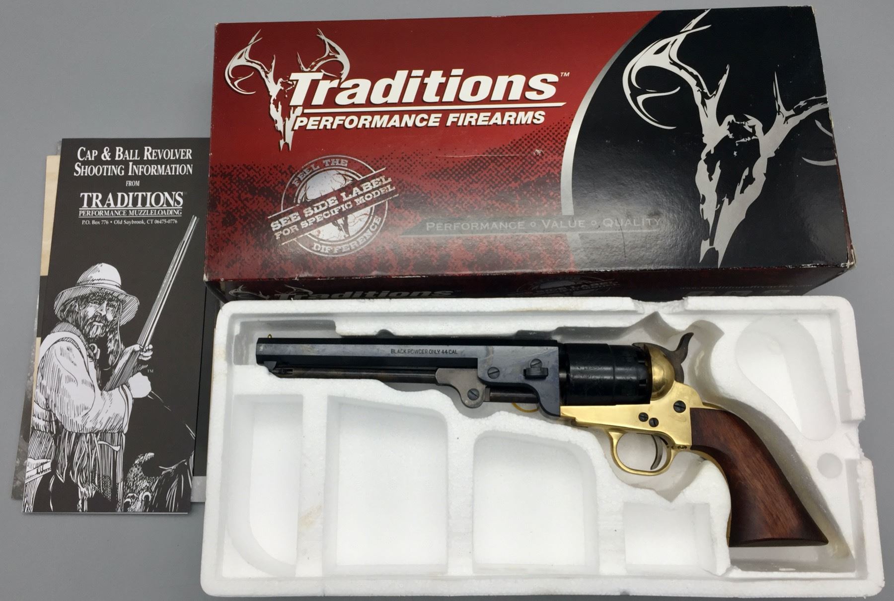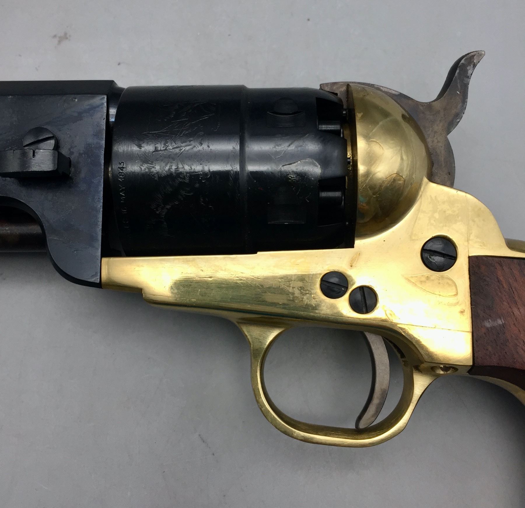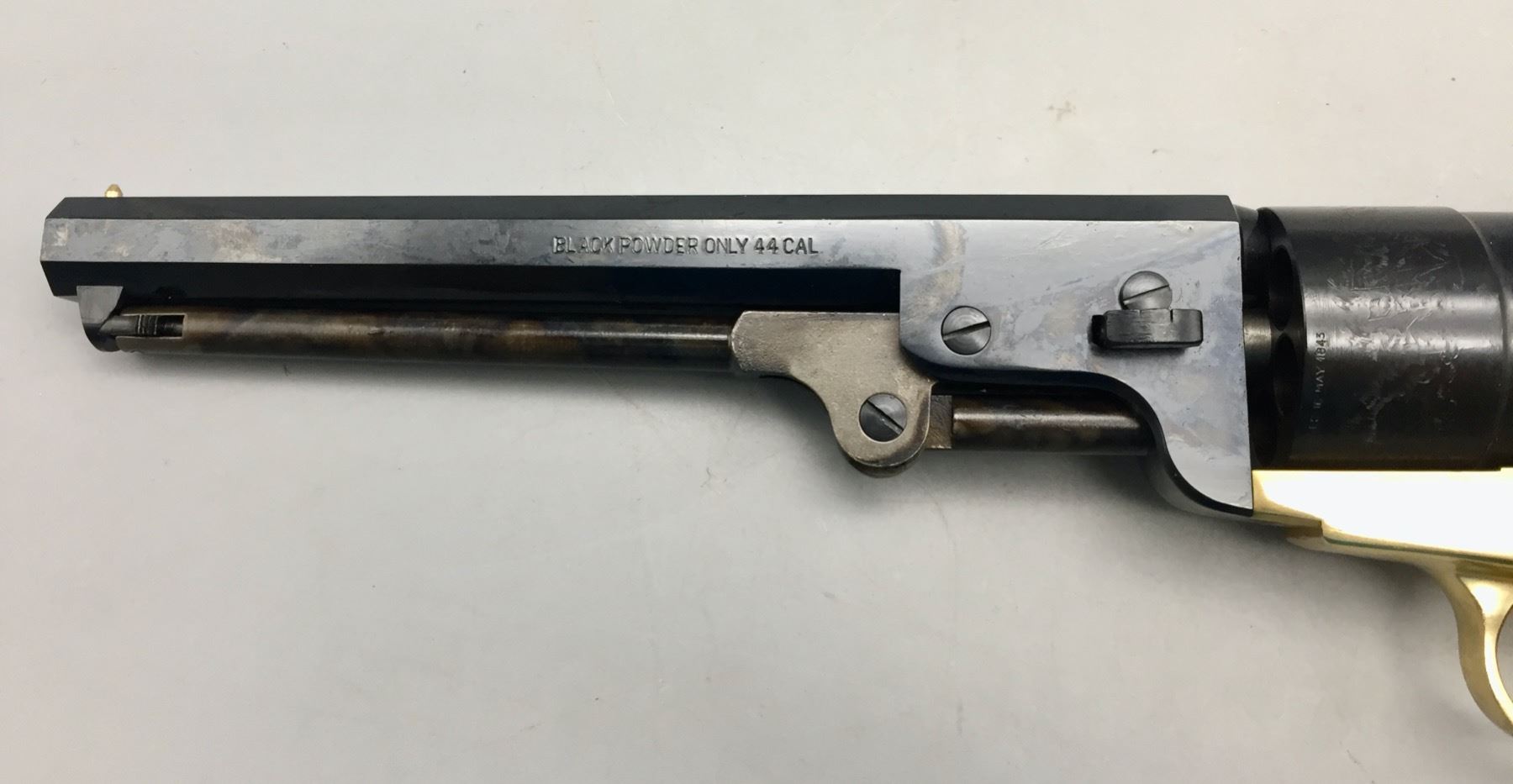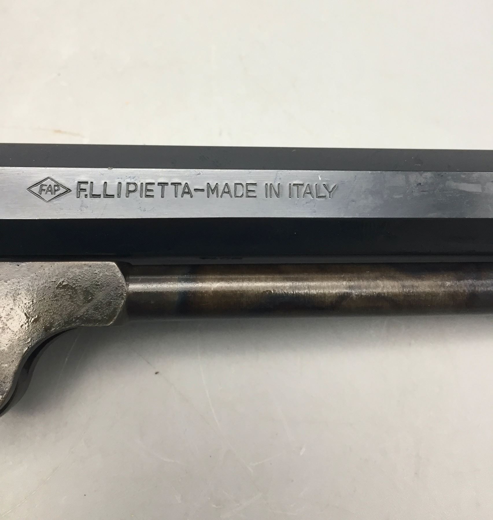Description: For your enjoyment, we offer for sale this 1851 Navy Revolver is a .44 caliber with a brass frame and walnut grips and in its original box and paperwork. Appears to be in unfired condition. Maker: F.LLI PIETTA, Performance Fire Arms CO. Approx. Age: Modern. Serial No. 640637. Size: Barrel measures 7-1/2†with an overall length of 14â€. Condition: Good. Please look closely at the pictures - they are an important part of our description. Shipping: There will be a $15 handling / packaging fee for shipping this lot. The actual cost of postage will be added on top of that. *BLACK POWDER Replica firearm DOES NOT REQUIRE an FFL Transfer*