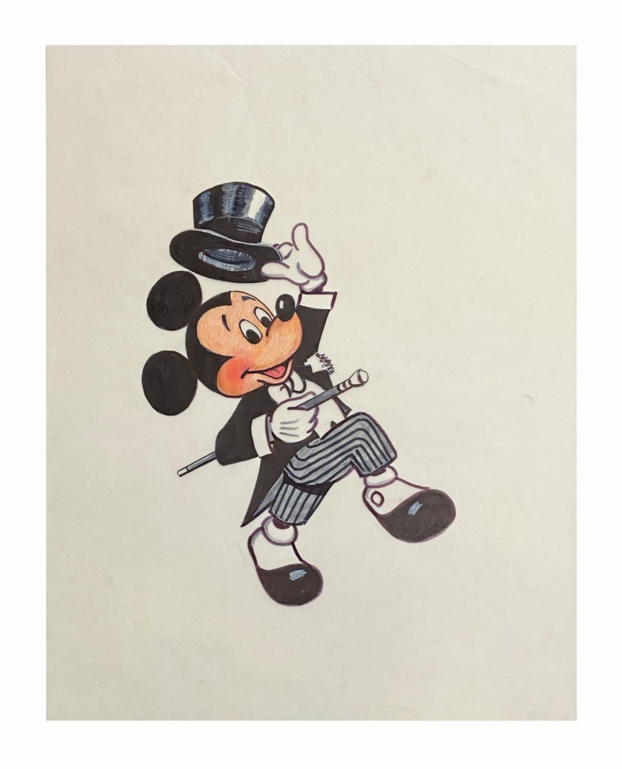 (Disneyland, c.1970s) An illustration of Mickey Mouse as a performer with top-hat and cane, likely used in promotional materials for the park. This illustration is accomplished in ink on vellum, and is hand-colored. This item measures 14"x11" and is in very good condition with little wear including a few tack-marks in the corners from use.