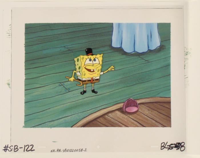 This original hand-painted background and animation cel are from the Nickelodeon TV show SpongeBob Squarepants. The story takes place under the deep blue sea in Bikini Bottom, where SpongeBob resides. SpongeBob, who is a yellow, porous sponge, is your typical happy-go-lucky character, as he is always cheerful and enjoys making people laugh. Patrick Star, SpongeBob's neighbor who is a starfish, is your average children's show idiot, as he boasts knowing nothing and is often getting himself into ridiculous situations. Between the homes of these two lies the home of the miserable Squidward, a squid, who is known for being grouchy and playing tricks on SpongeBob and Patrick. Both SpongeBob and Squidward work at the Krusty Krab, a fast food business run by the greedy money-loving Mr. Krabs, a crab, the arch rival of the evil, possibly misunderstood, Plankton. Another neighbor, Sandy Cheeks, an athletic squirrel who normally wears an astronaut's space suit, was introduced in "Tea at the Treedome." She spends most of her time inventing and experimenting. SpongeBob is putting on a show.Original Production Background and Animated Cel Overall Size of Background: 11" x 17" Overall Size of the Cel: 10 1/2" x 12 1/2" Very good condition; it has been storedThis is an original hand-painted cel set-up used in the production of an episode of "SpongeBob SquarePants." Each one-of-a-kind set-up represents a slight change in position of the characters. When individually photographed and projected in rapid succession, the images appear to move.