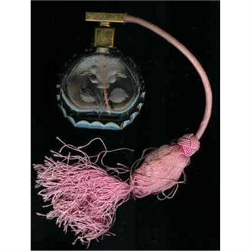 All Original and in perfect working order, this atomiser is inscribed around the brass collar "Peter K London Ltd." Clear lead crystal with an intaglio carved rose on one side. Slight fraying where the "puffer" meets the brass and the ball end needs strands rethreading. Circa 1950