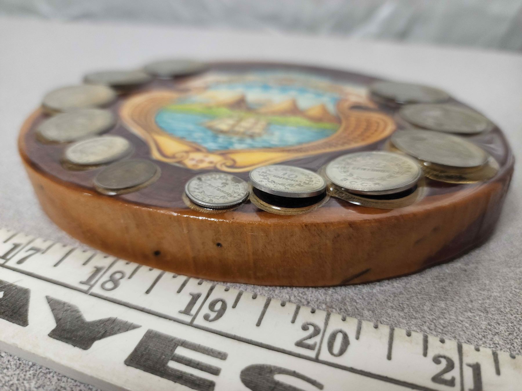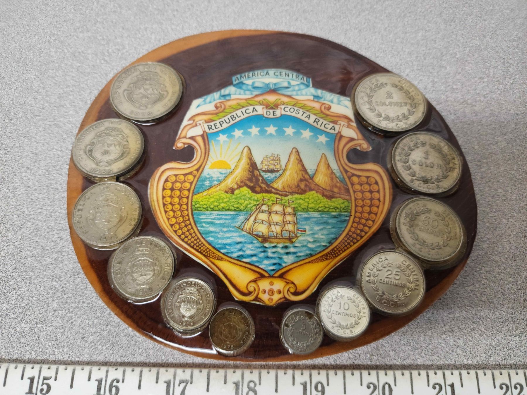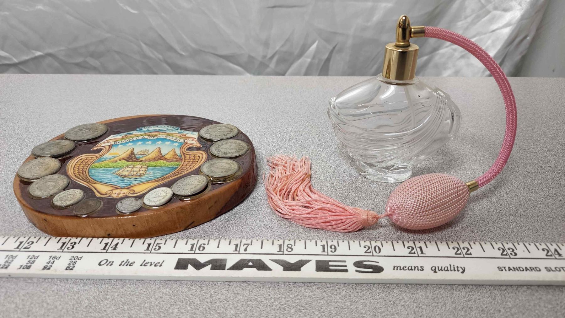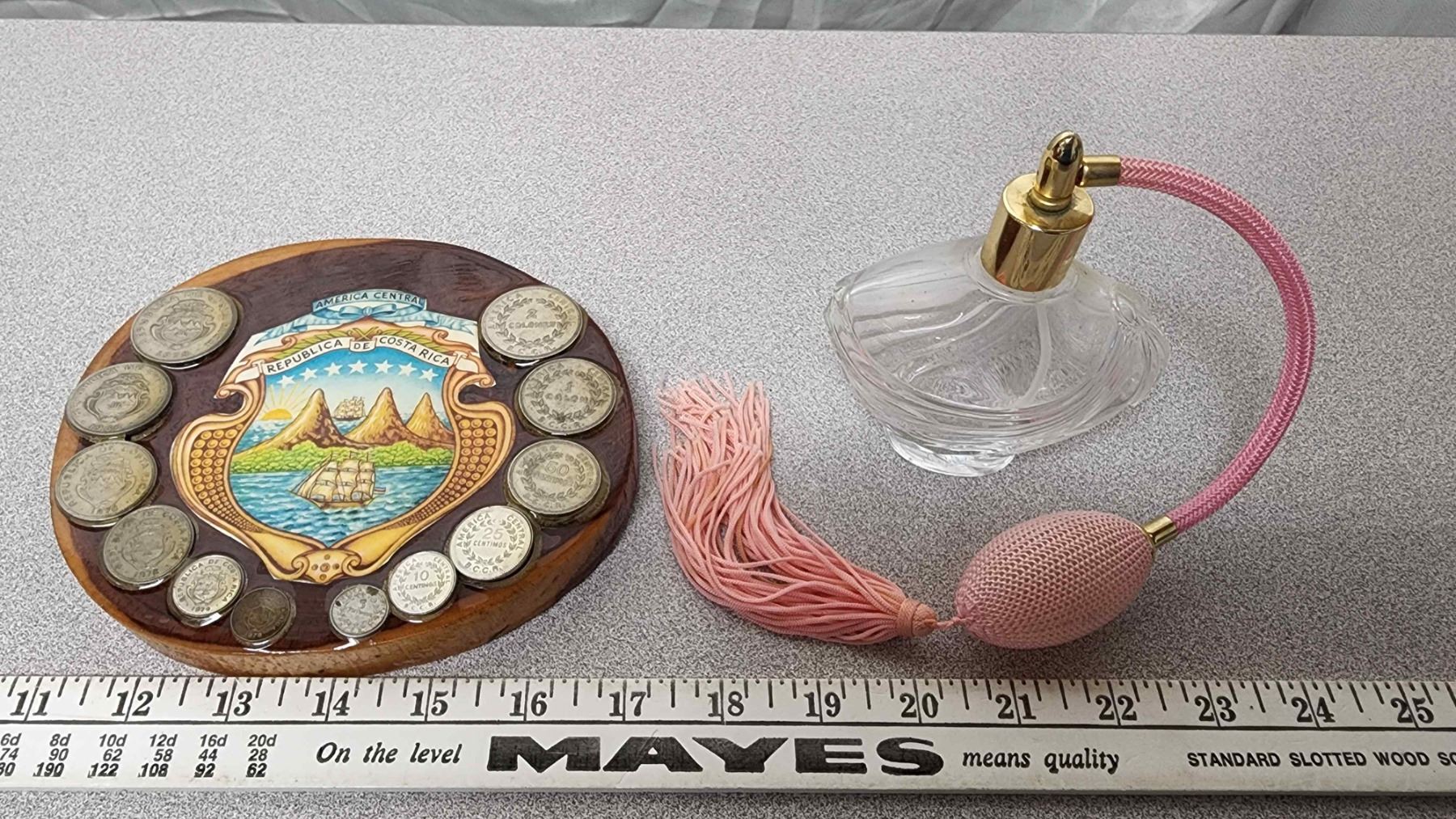 Perfume Atomizer + Costa Rica Plaque with coins from 1965-1978