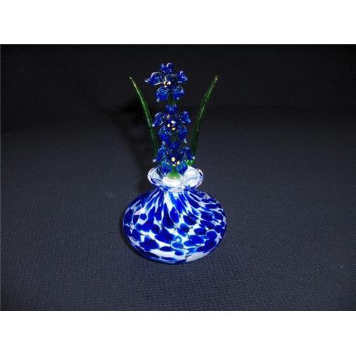 A very striking Art Glass Perfume Bottle. I've never seen one like it before. The blue is very vivid and stands out from the white. The stopper is three blue flowers on a green stem, with two green leaves, one on each side. Check the photos. Have a look at my other items. Thank you for viewing