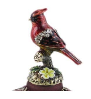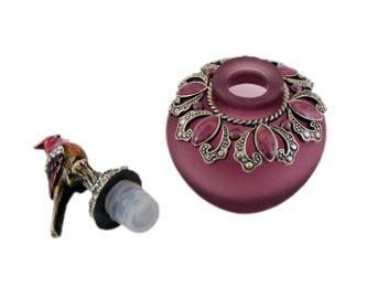 Collectible red cardinal bird perfume bottle bejeweled top and base. Vintage style colored purple.