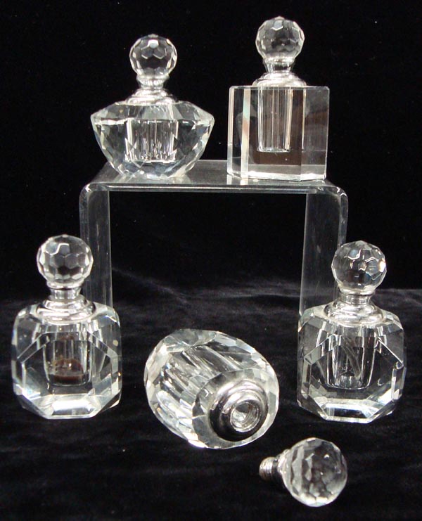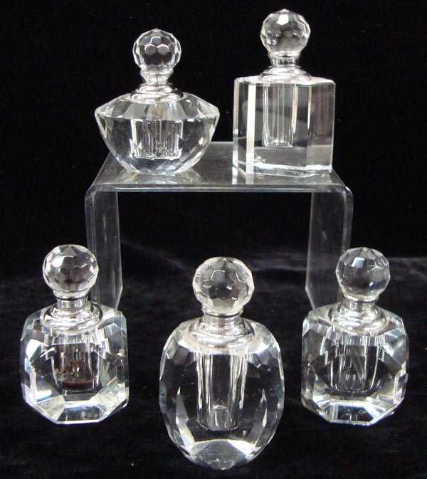 Five faceted glass perfume bottles with screw tops. No cracks or chips. Tallest 3'', widest 2''. Buyers Pay Actual Shipping and Handling Charges(see terms and conditions for more information)