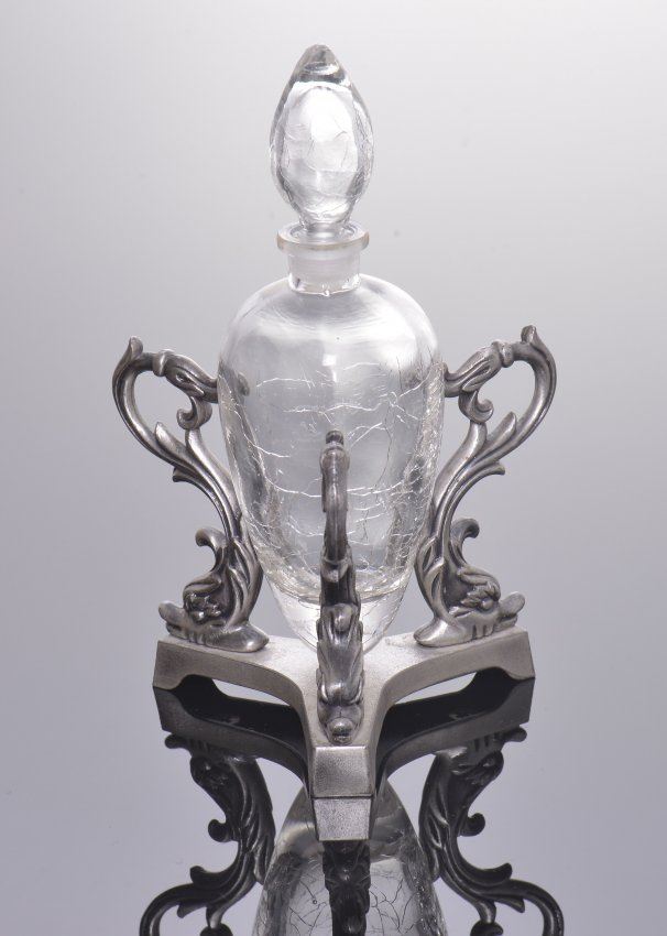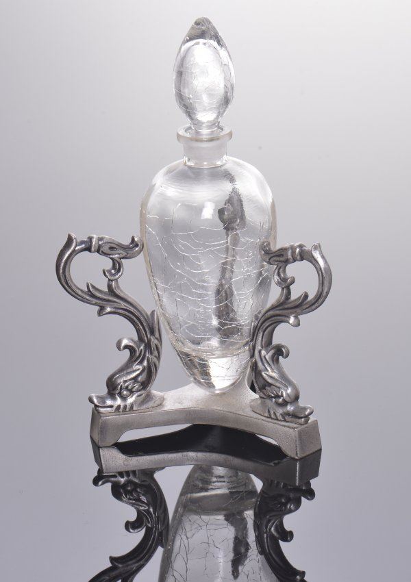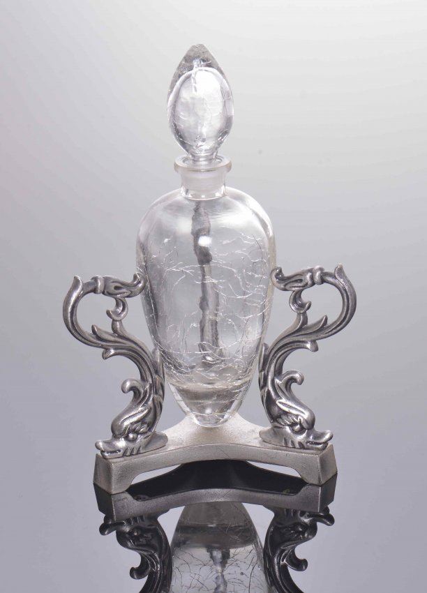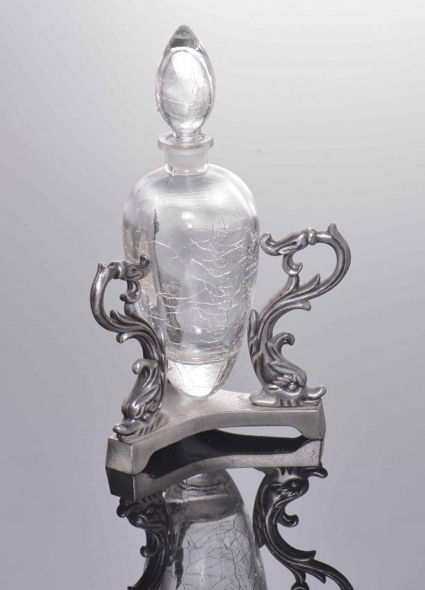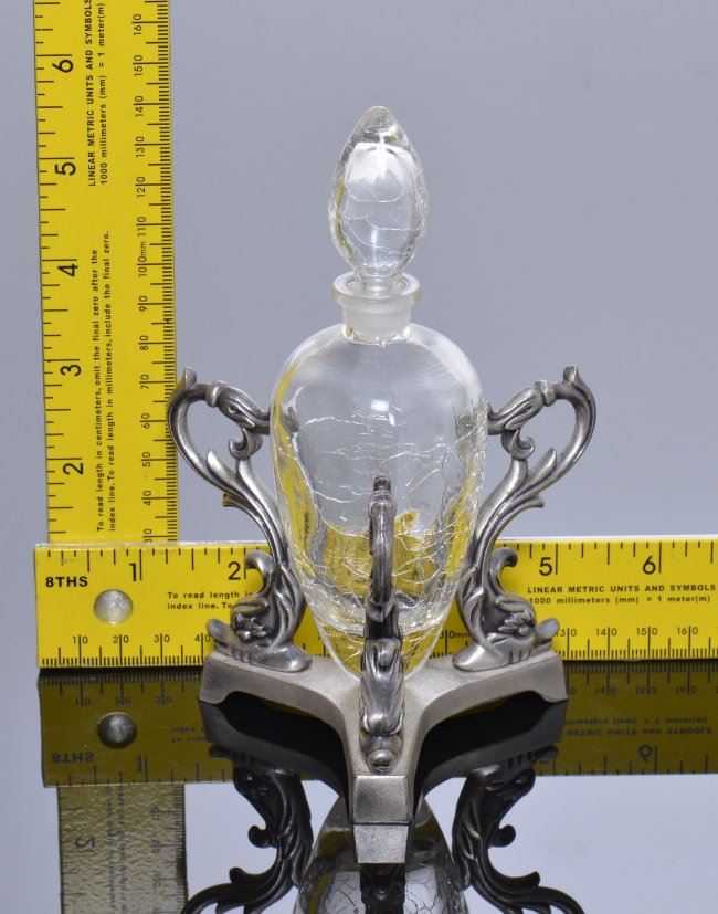 Perfume bottle with crackle style mounted on ornate metal base. SIZE: see attached ruler photo. Photos are part of the description representing the condition report and can be used for authentication prior to the sale date. Pangaea Auctions urges Bidder's to view all attached photos in detail.