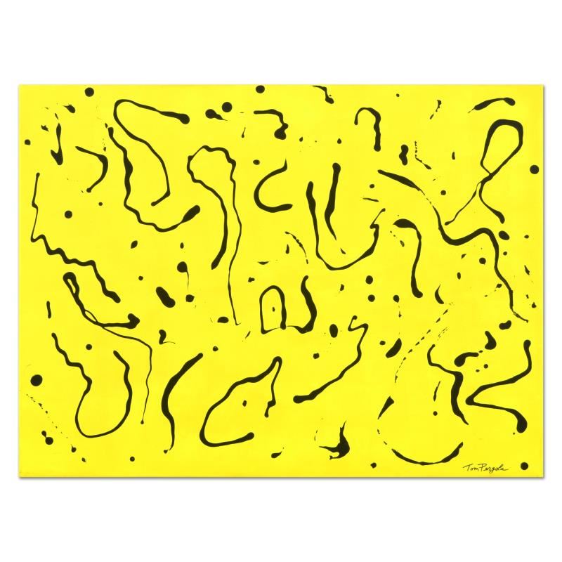 "Black and Yellow" is an original mixed media on canvas by Tom Pergola, hand signed by the artist. This piece comes gallery wrapped. Includes Certificate of Authenticity. Measures approx. 40" x 30" (image).