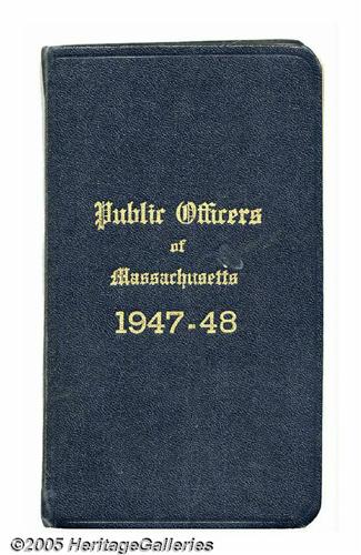 <B>Perhaps John F. Kennedy's First Listing as a Congressman</B></I> This leatherette-bound 378-page book was an official Massachusetts state issue, and included a full page with photo on each state office holder, plus the Massachusetts U.S. Senators and Congressmen. Pictured is a fresh-faced JFK, who had been elected to Congress the previous fall, but was not yet serving; according to his biography, he had not yet even been assigned to any legislative committees! First example we have seen of this great, early JFK political artifact. Very nice condition, measuring 3.25" x 5.75". Lot:264