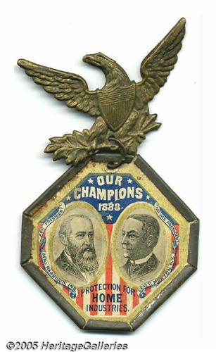 <B>Perhaps the Most Colorful and Desirable Badge Variety for Benjamin Harrison and Levi Morton</B></I> This large 1888 badge is a perfect centerpiece for any collection. Excellent condition, with pin for wearing on the reverse. Diameter 46 mm. Lot:260