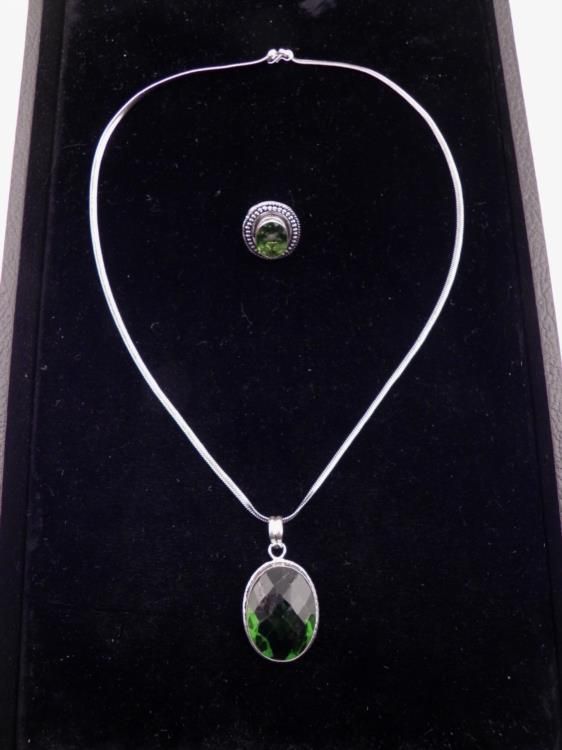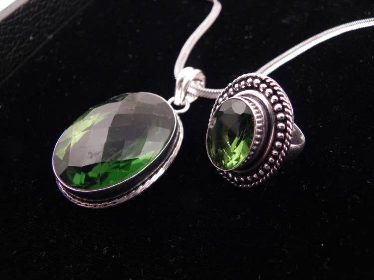 Ring & Pendant Necklace SetGemstones: PeridotCut: Oval, facetedPendant: 32 mm stone, in German setting, on 20" chainRing: 17 mm stone, in sterling beaded and rope pattern settingCondition: Excellent