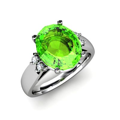 Peridot 4.00 ctw & Diamond Ring 14kt White Gold **|**|** Mainstone: Peridot ; Total CTW: 4.00 ; Shape: Oval ; Gem Size: 12x10mm ; Metal / Purity: 14kt White Gold ; MSRP: $1400