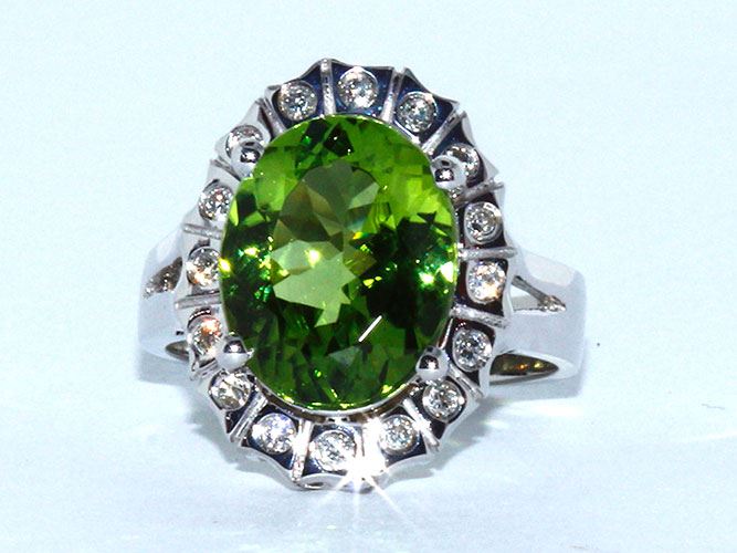 14k White Gold, Peridot 5.23ct Excellent Oval Cut Great Green Color, .21ctw Round Diamond G-H color VS-SI clarity