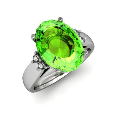 Peridot 6.00 ctw & Diamond Ring 14kt White Gold **|**|** Mainstone: Peridot ; Total CTW: 6.00 ; Shape: Oval ; Gem Size: 14x10mm ; Metal / Purity: 14kt White Gold ; MSRP: $2100
