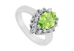 A feminine pear-shaped rich peridot is enhanced by an array of brilliant round diamonds. Made in 14K white gold this beautiful ring has a total weight (TGW) of 1.50 ct.
