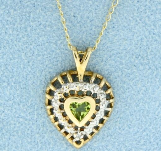 In 10K yellow & white gold, it contains a 4mm heart shaped peridot that has excellent color & clarity, as well as one 1/2pt diamond. The chain is 18 inches long. 1.5g