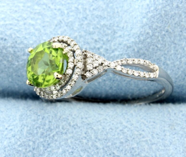 This exquisite diamond mount Halo style ring has a stunning 7mm genuine Peridot gemstone at the center. The ring is set in 14k white gold and there are 100 diamonds set in the mounting, SI clarity and G-H-I color, and total 0.80 carats. The round genuine Peridot is approximately 0.90 carats! This ring is like new and the style is fabulous! Size 7 2.6g