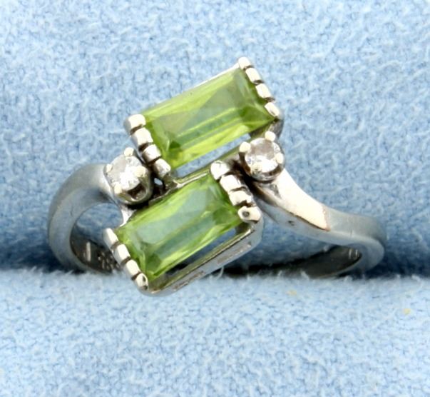 This ring is is 14K white gold and has two 6x4mm peridot gemstones that are approximately 1ct total weight as well as two .02ct diamonds. Size 5 2.8g