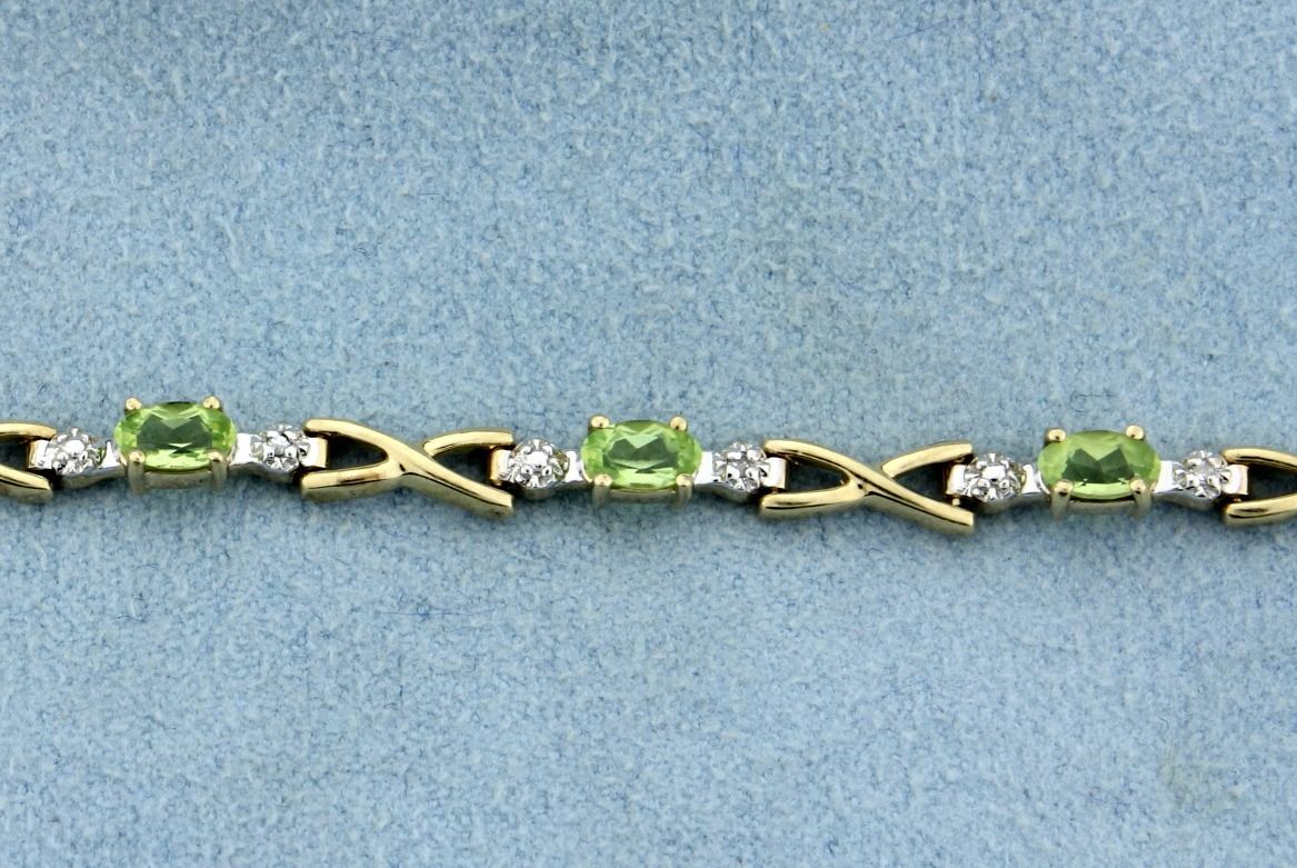 This 10k yellow gold bracelet offers 10 oval gem quality 5mm x 3mm Peridot that have a total weight of 2.50 carats. There are also 10 diamonds that total 0.10 carats. This beautiful bracelet measures 7 3/4" long. 3.6g